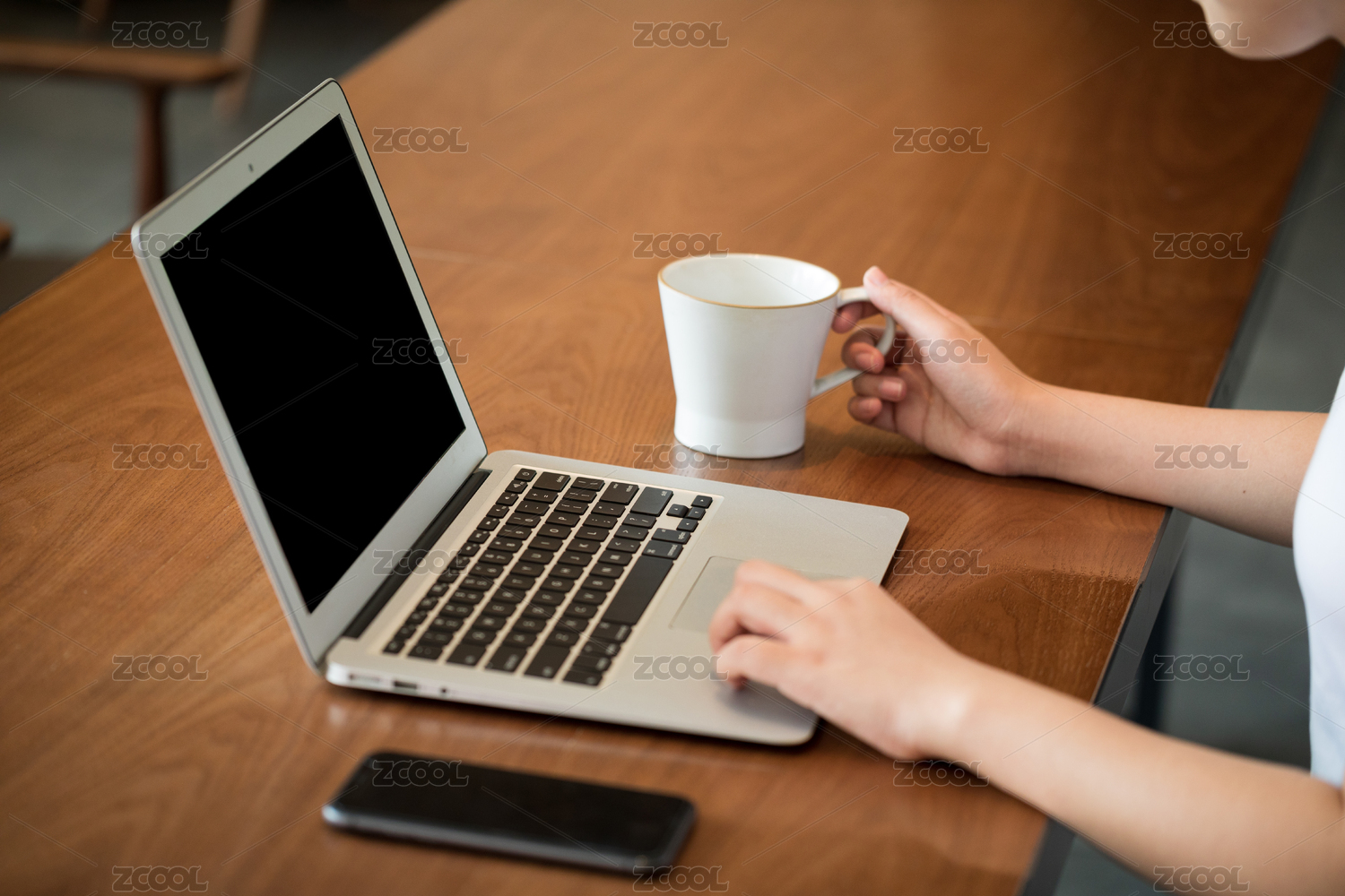 办公桌面上的电脑与咖啡杯,休闲办公概念