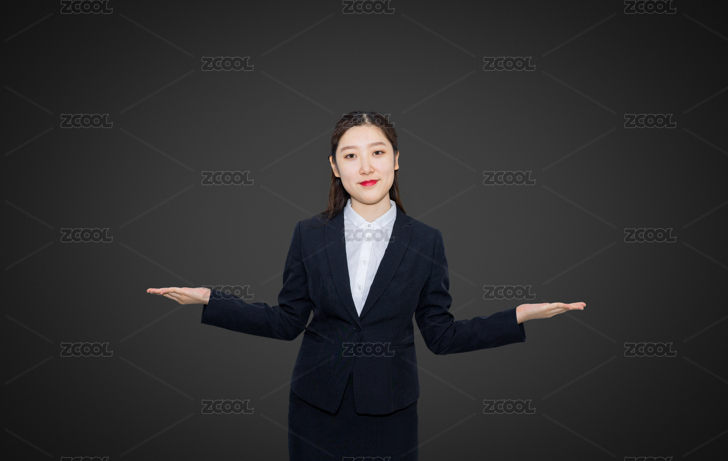 白色背景下穿着正装的美女做出热情欢迎的动作