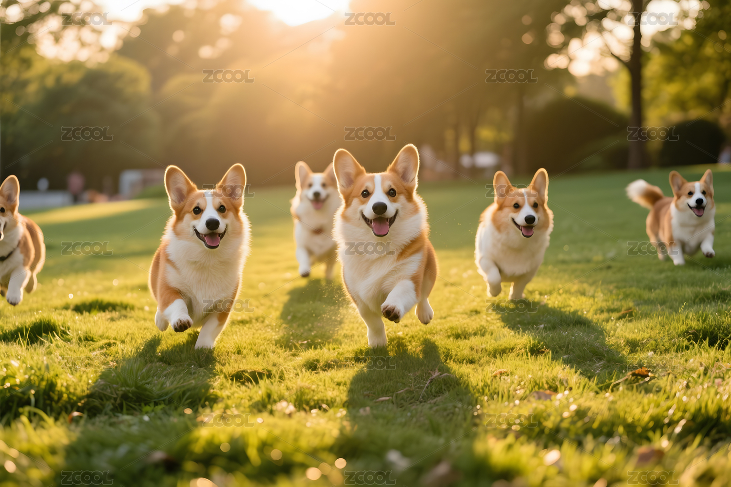 可爱宠物狗柯基在夕阳下快乐奔跑