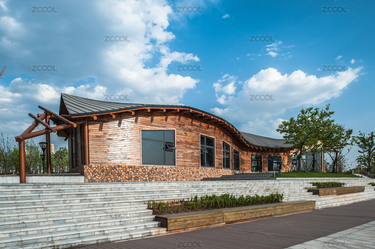 中国哈尔滨秋季晴天太阳岛景区中式建筑树林草地