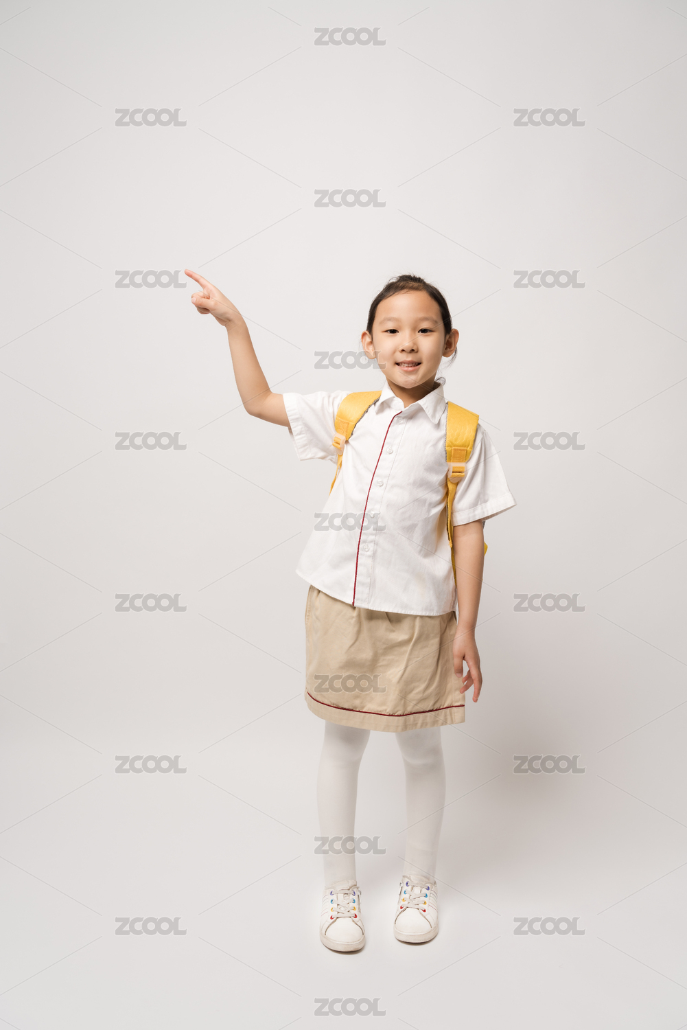 站在白色背景前穿校服的中国女孩