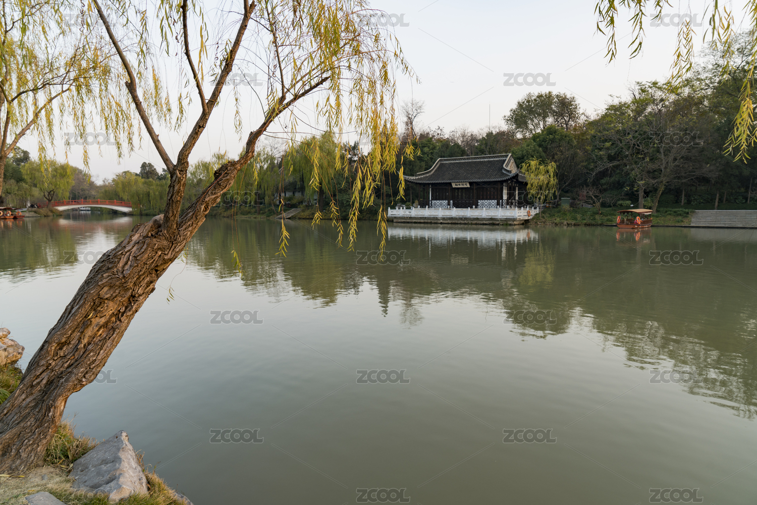 秋天中国扬州瘦西湖风景区的枭庄和游船码头