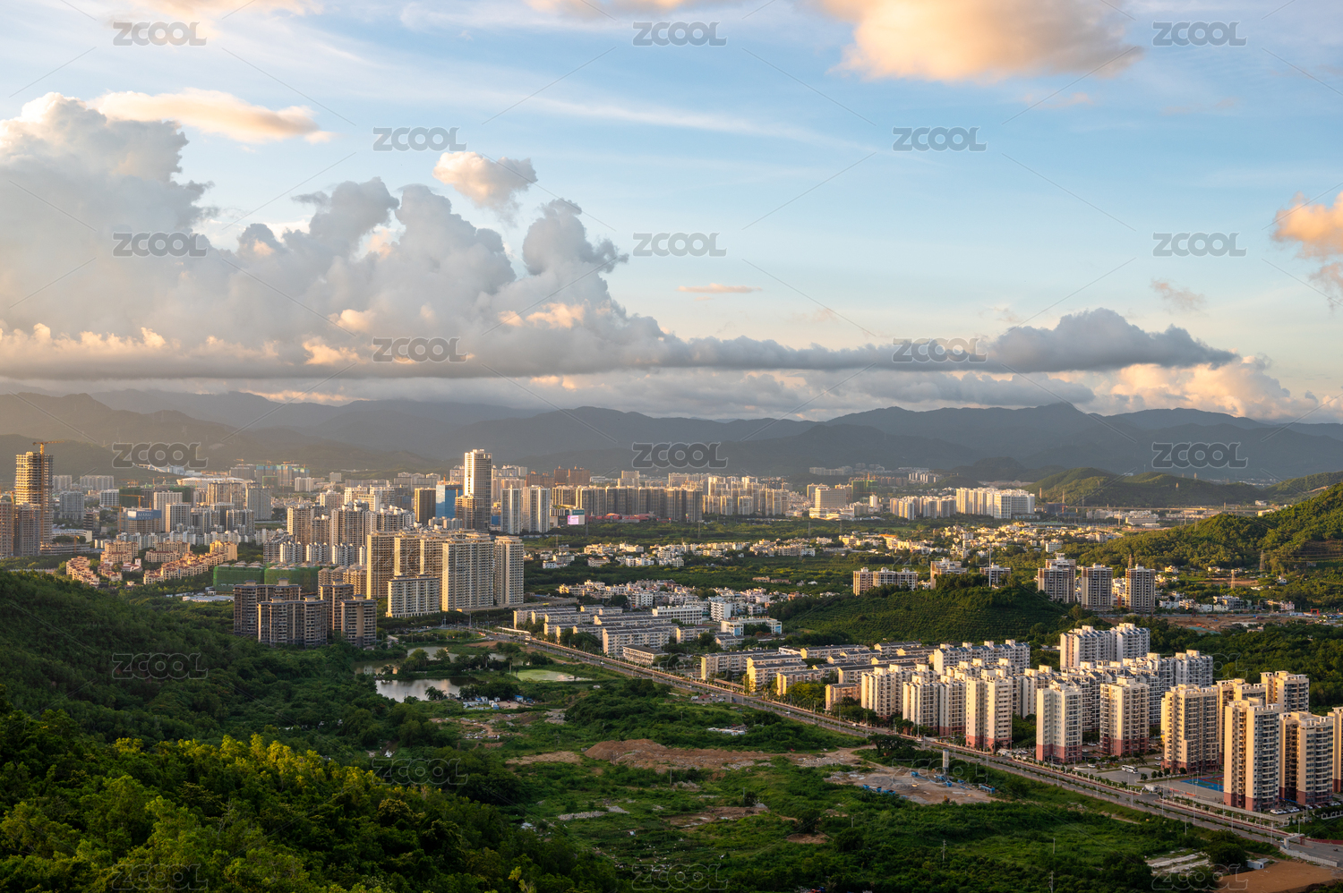 黄昏夕阳下鸟瞰海南省三亚市三亚湾城市风光