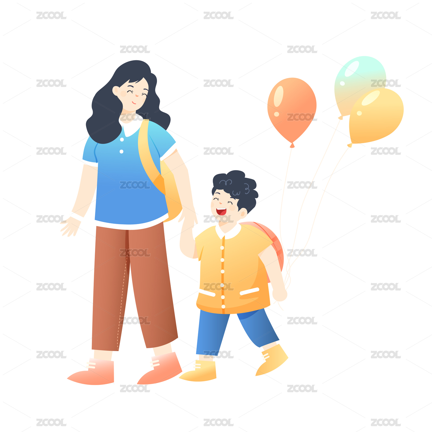 红色叶子前牵手走路的幸福母女俩温馨插画
