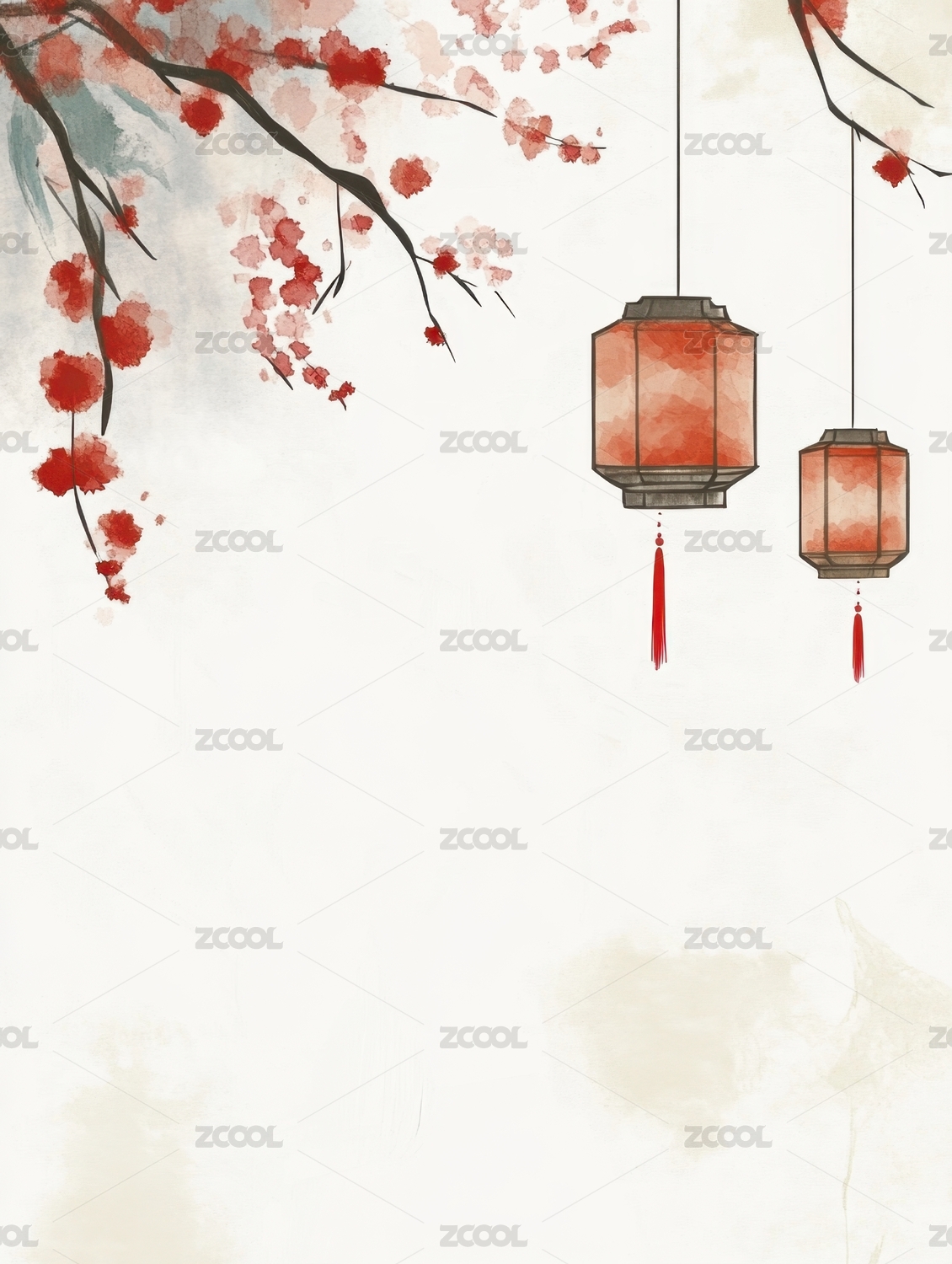 水墨红灯笼与樱花枝