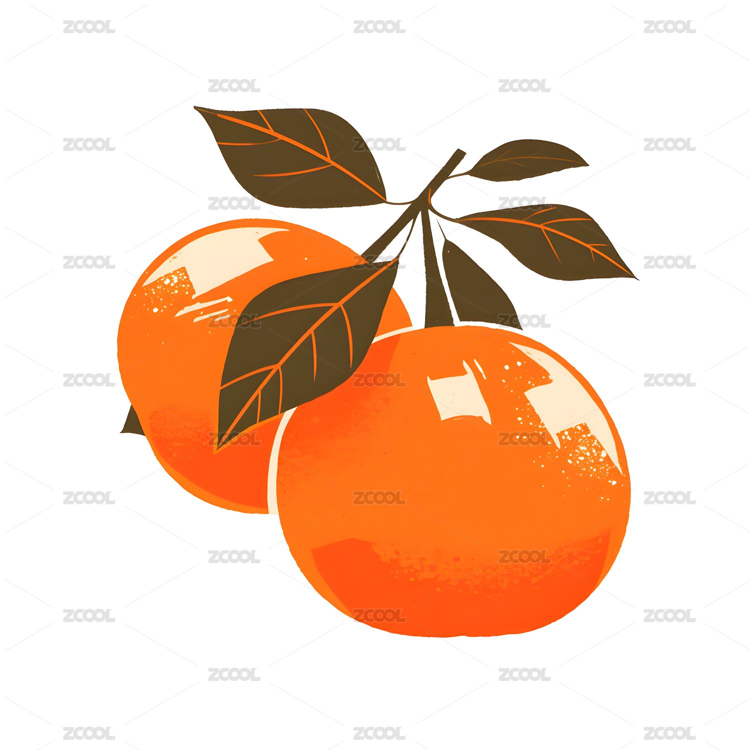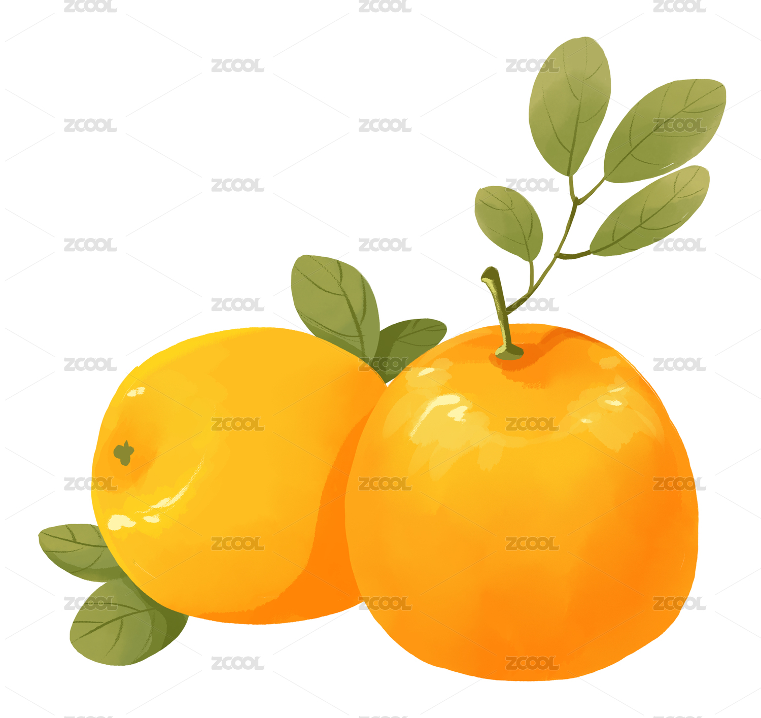 手绘质感橘子带树叶