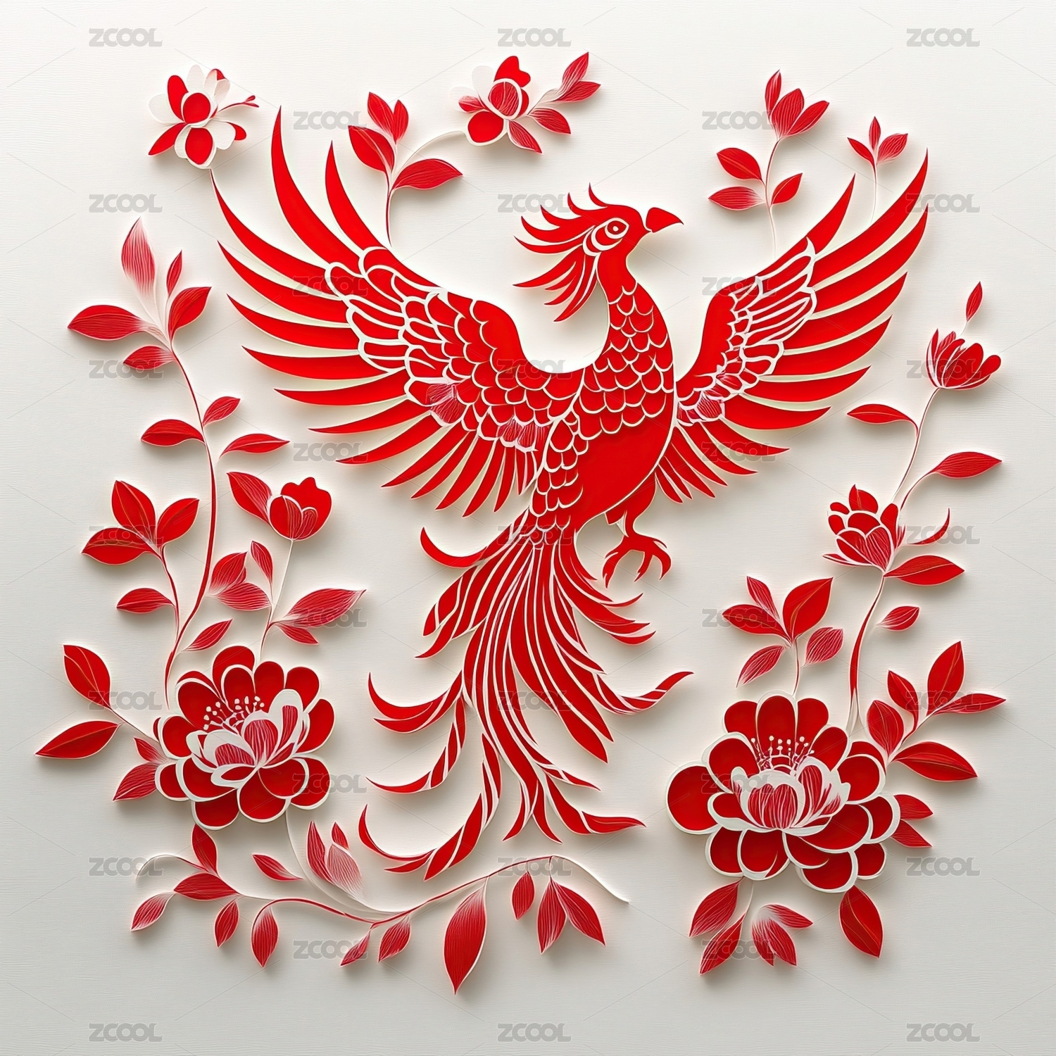 中国剪纸蛇年凤凰红色剪纸插画背景