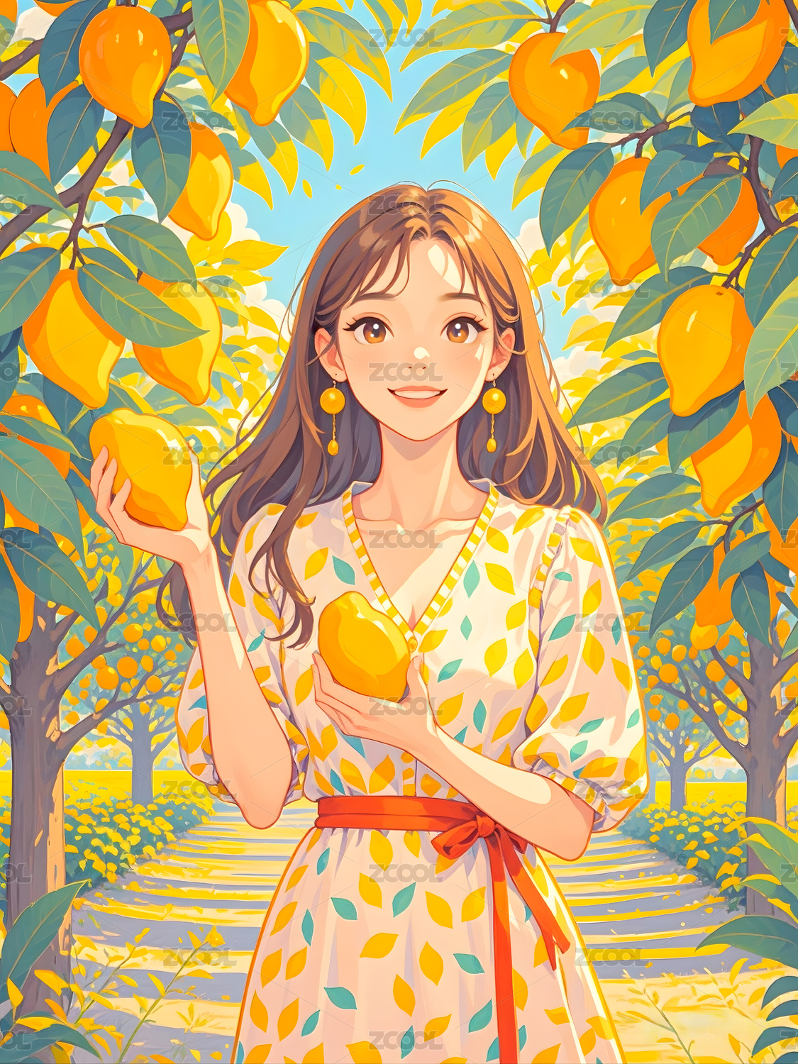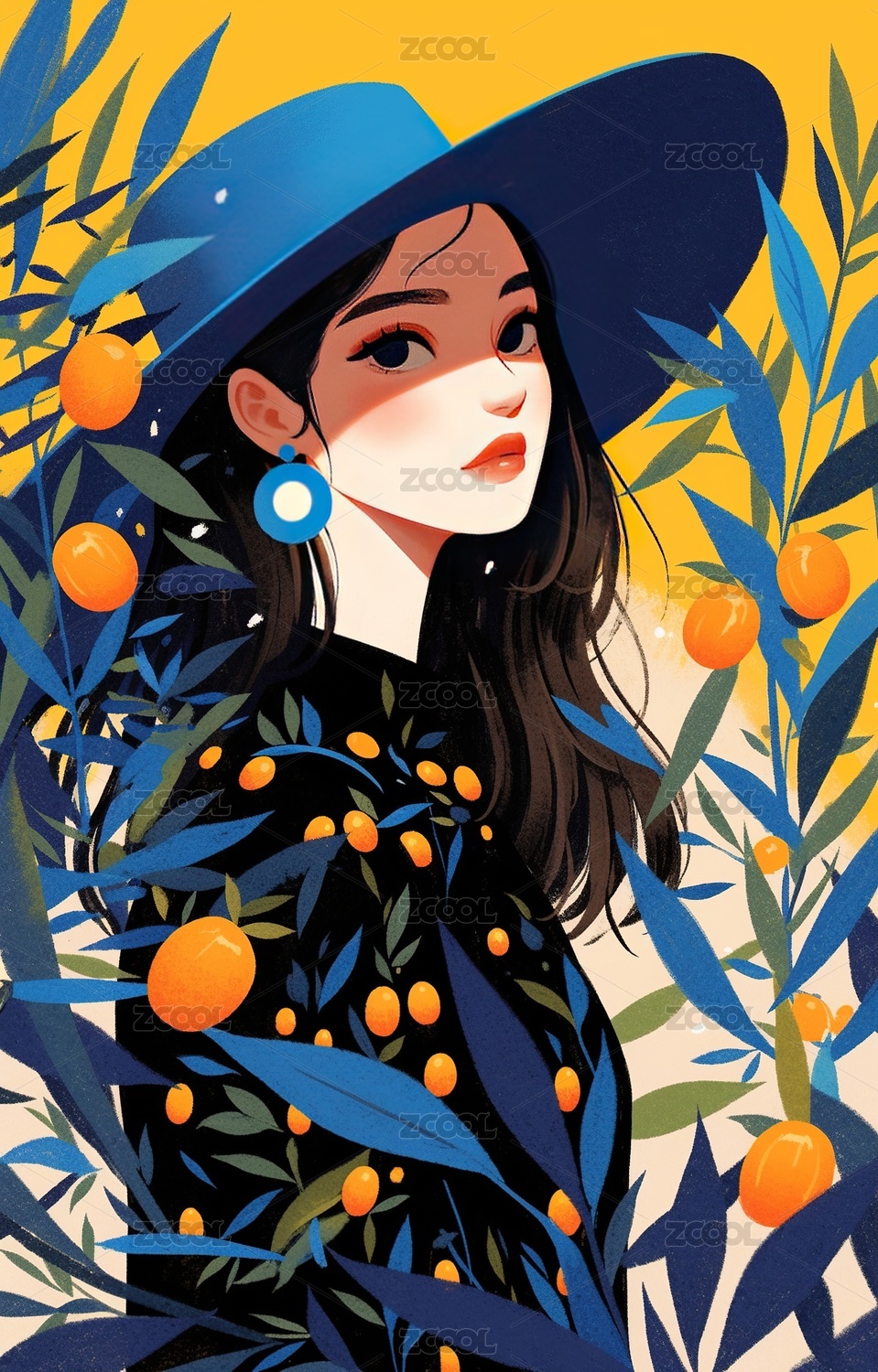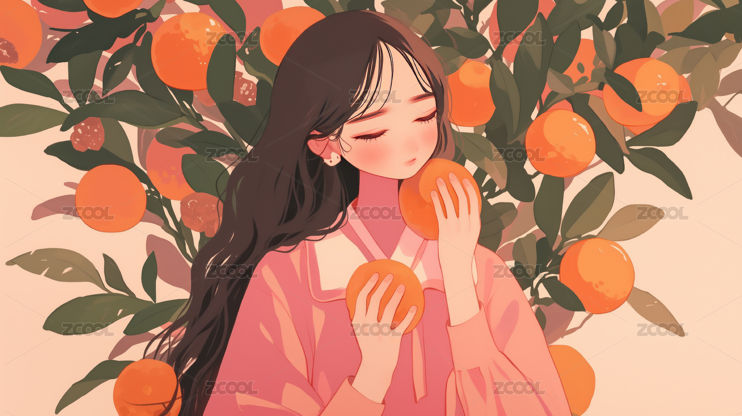 女生户外自然橙子树清新治愈系插画