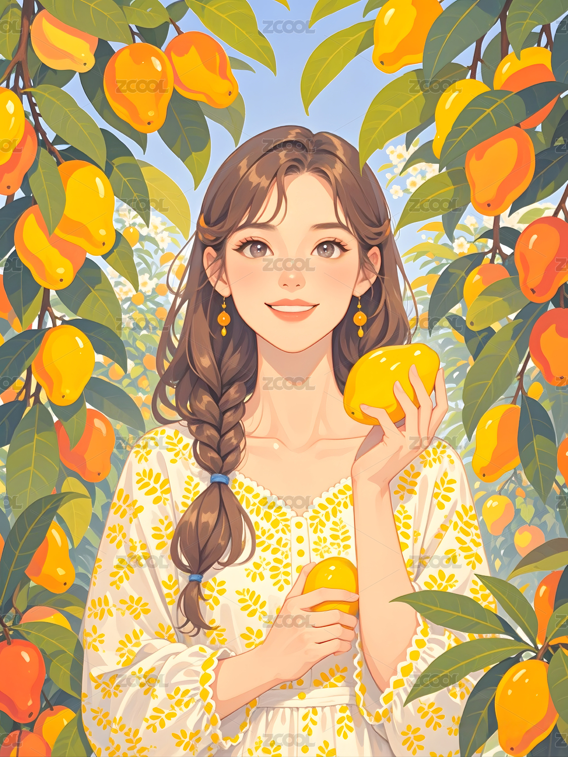 果园里采摘芒果的甜美女孩