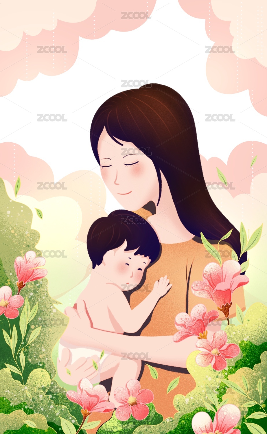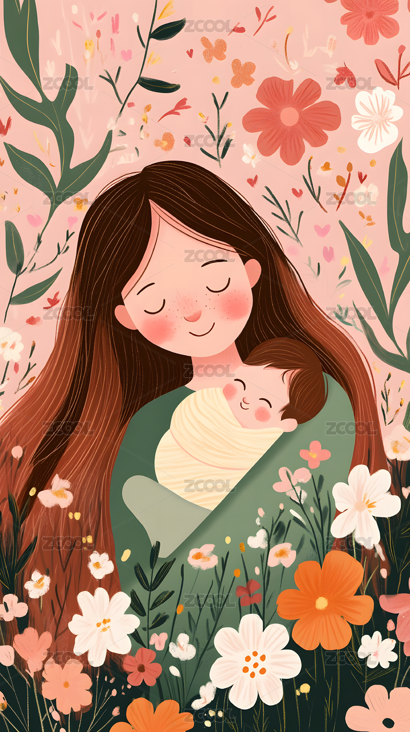 康乃馨花丛中母亲抱着熟睡的婴儿母亲节插画