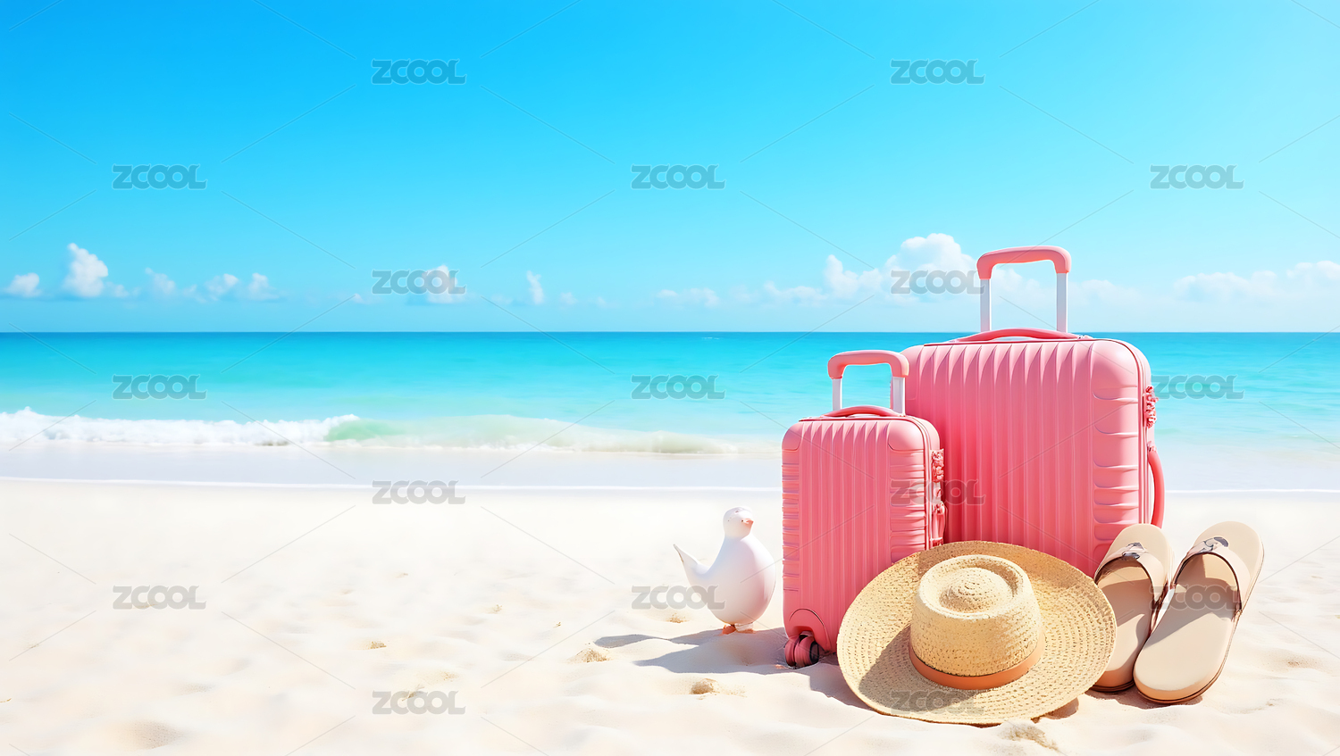 沙滩上的遮阳伞旅行箱 旅游度假概念