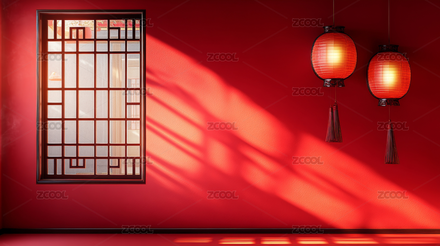 中国风复古屏风门和灯笼红色喜庆展台背景