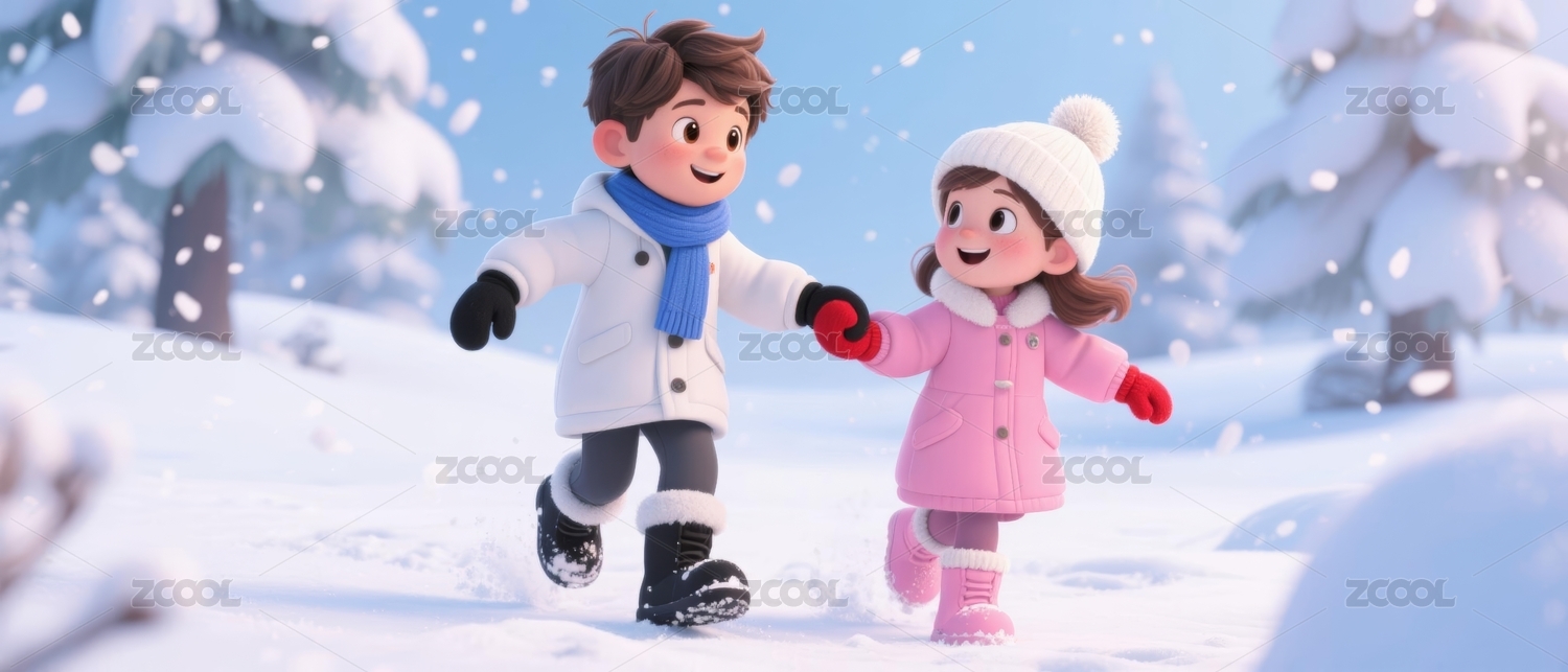 卡通人物冬日漫步场景
