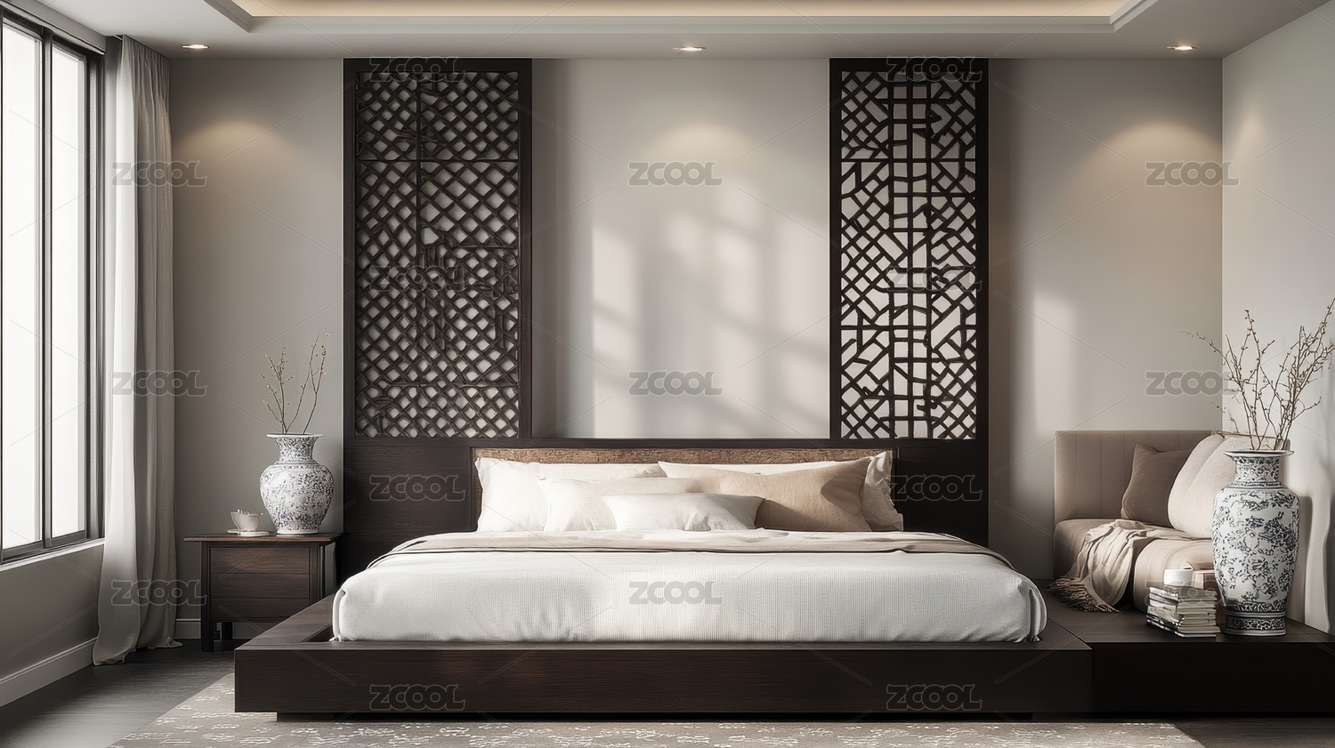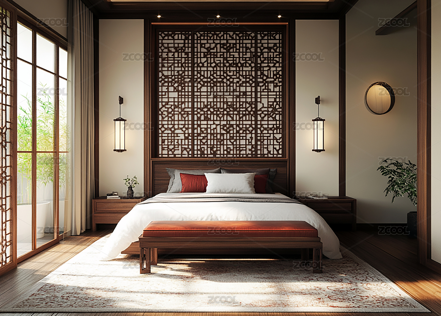 卧室,床,中式风格,现代简约,装修设计,家居,室内设计,木质,家具,灯