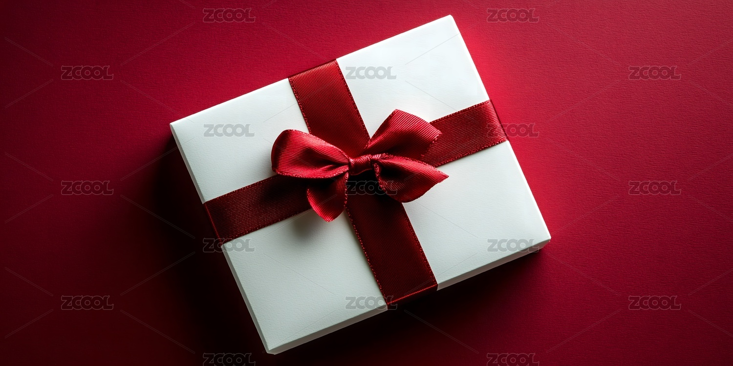 放在红色背景的绑着香槟色带子的红色礼物盒局部