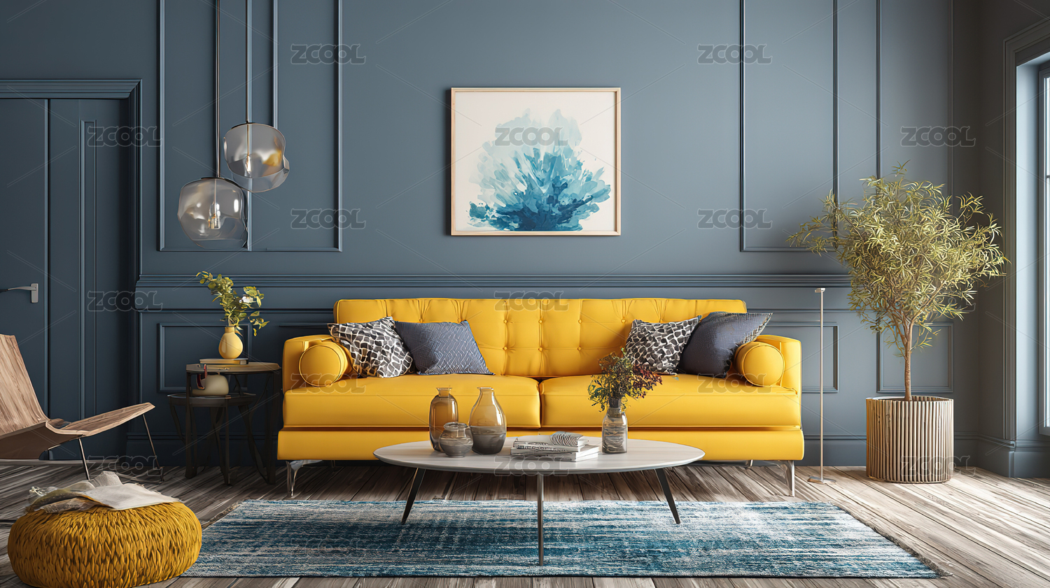 蓝色墙面现代客厅几何装饰