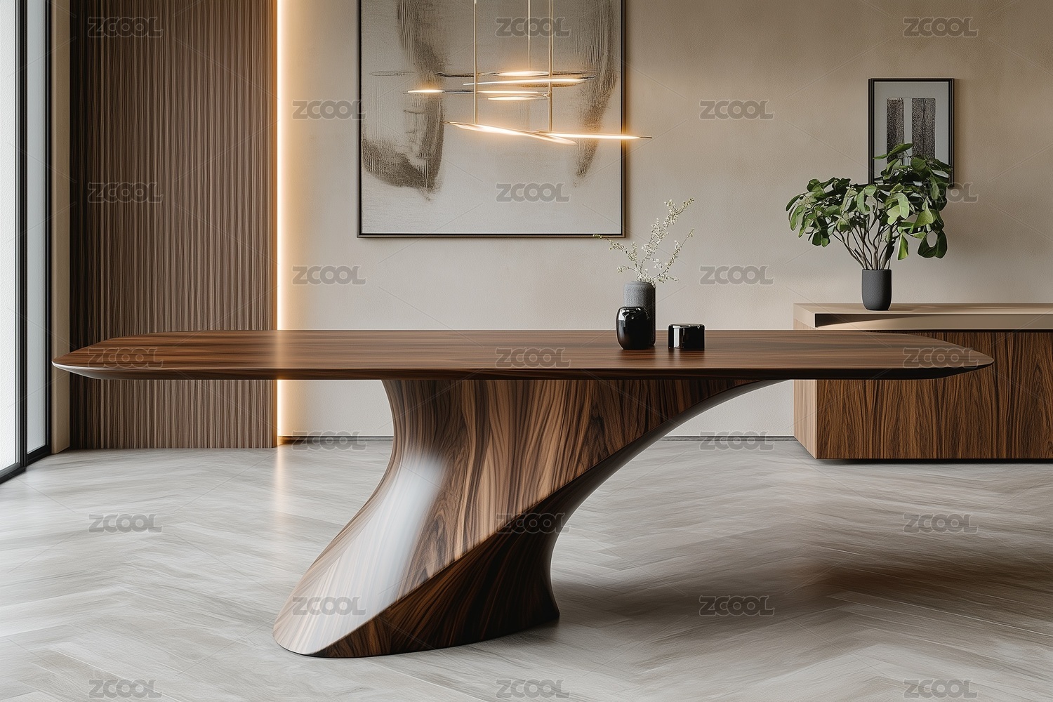 现代风格,木制桌子,深红色桌面,三角形,支撑结构,棕色花瓶,干枯树枝,细小植物枝条,暗红色墙壁,简约优雅