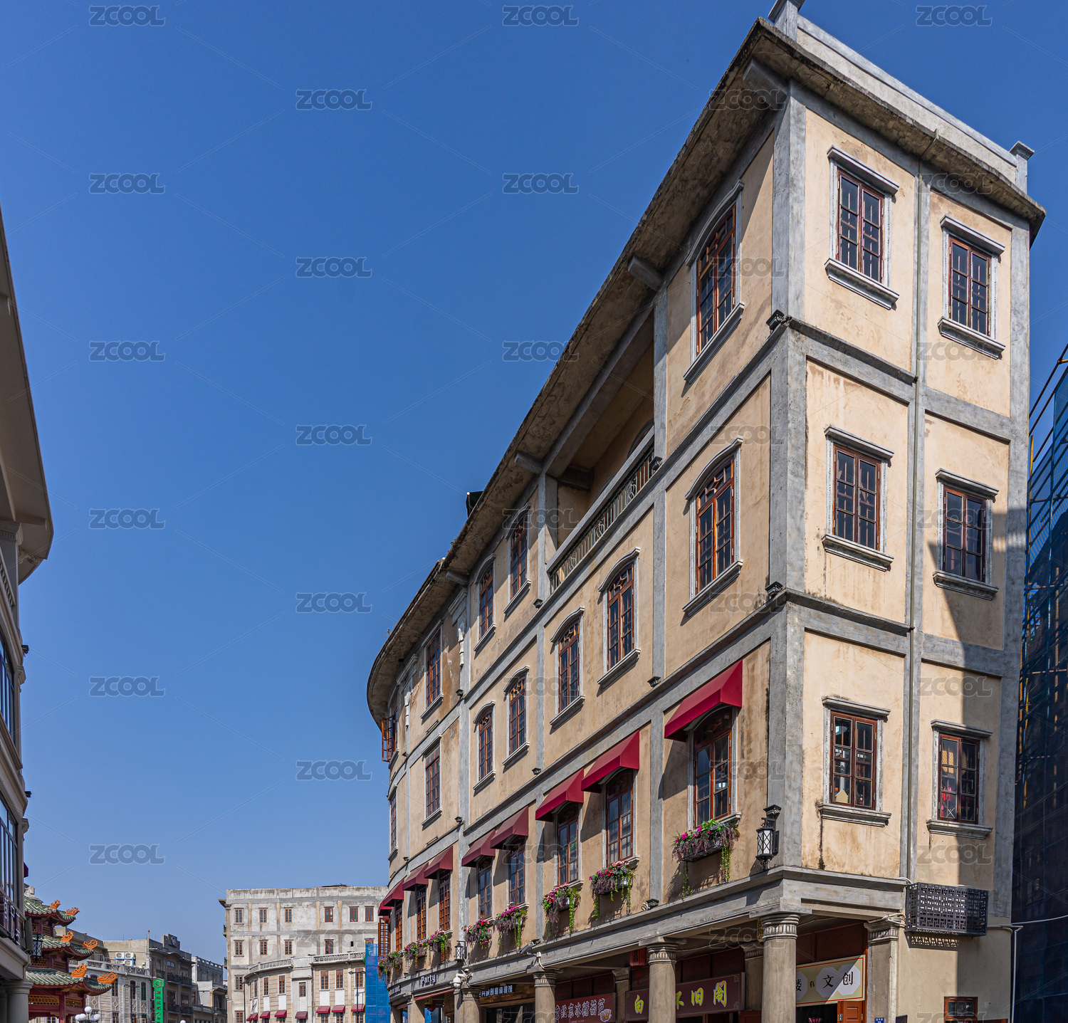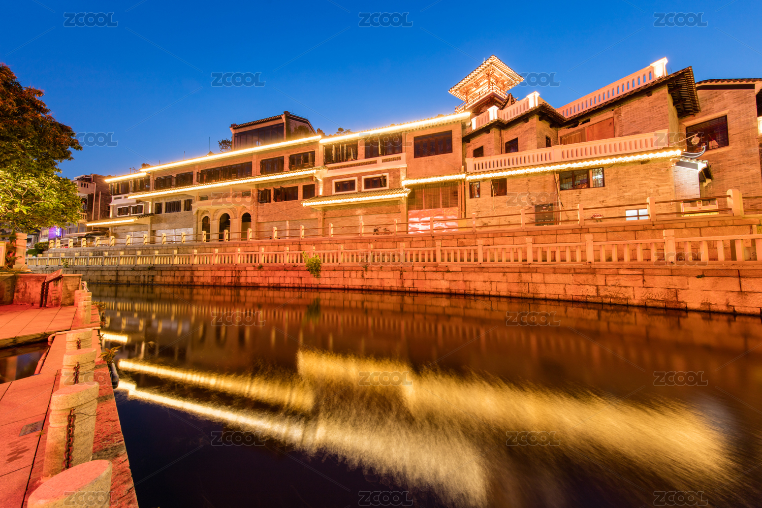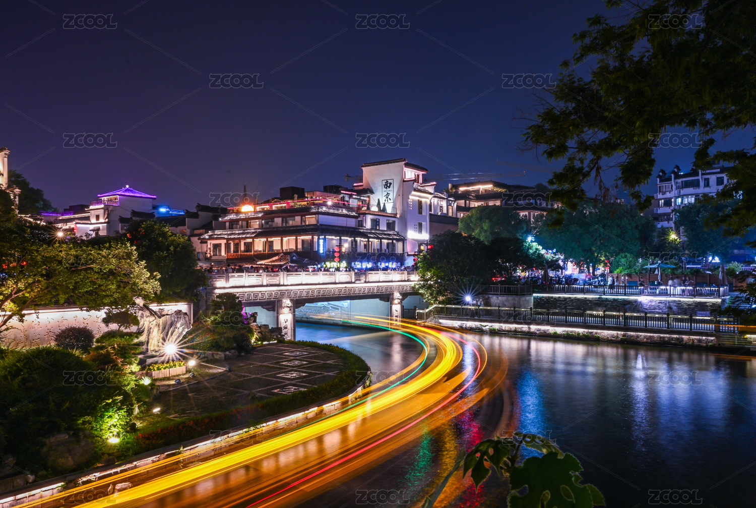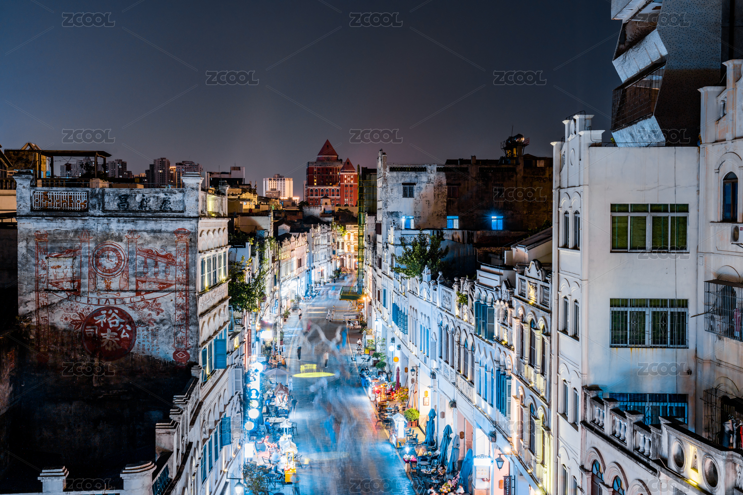 海南省海口市夜晚的骑楼老街灯光摇曳车流