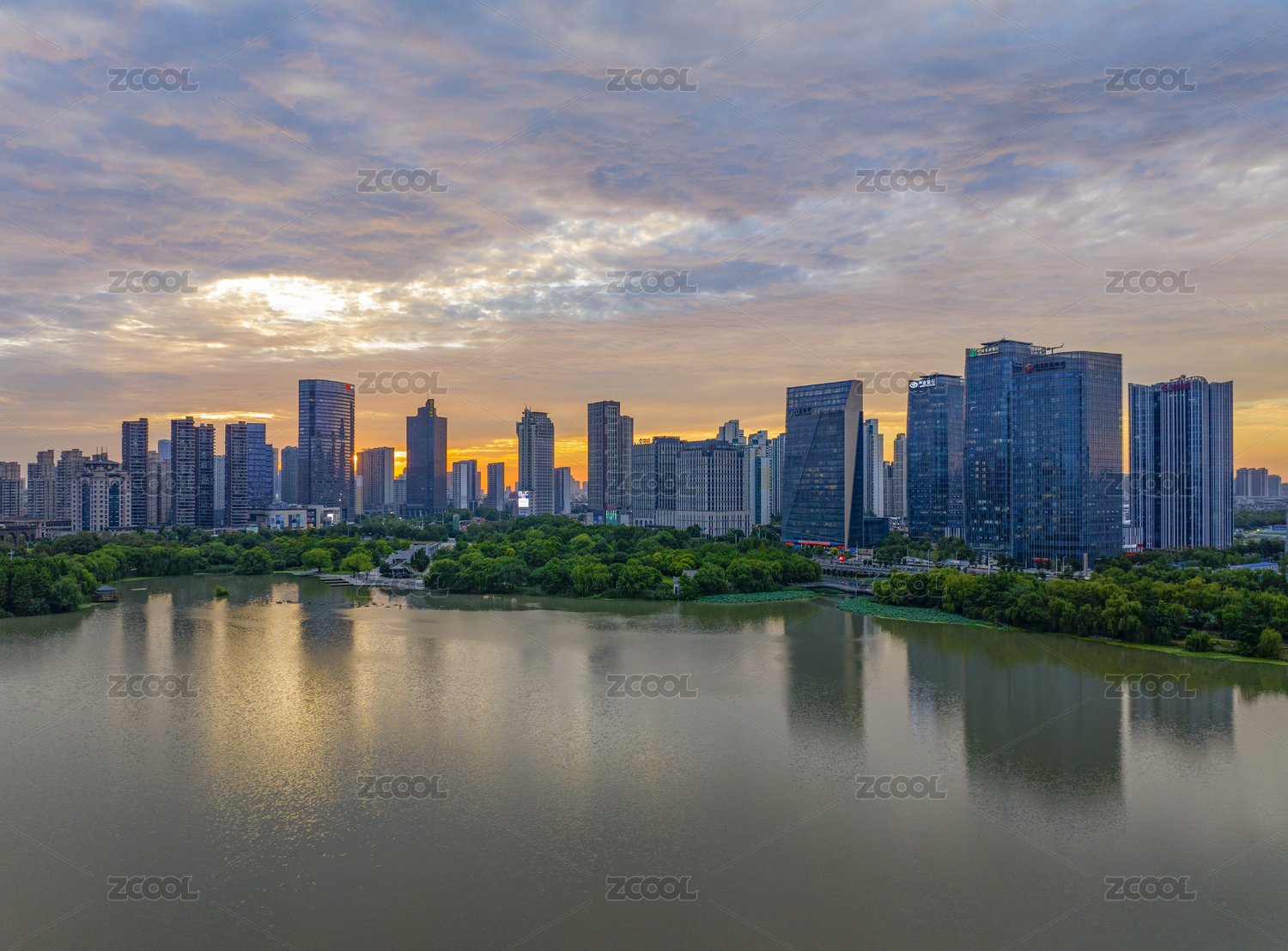 南宁南湖公园夕阳黄昏与城市摩天大楼建筑