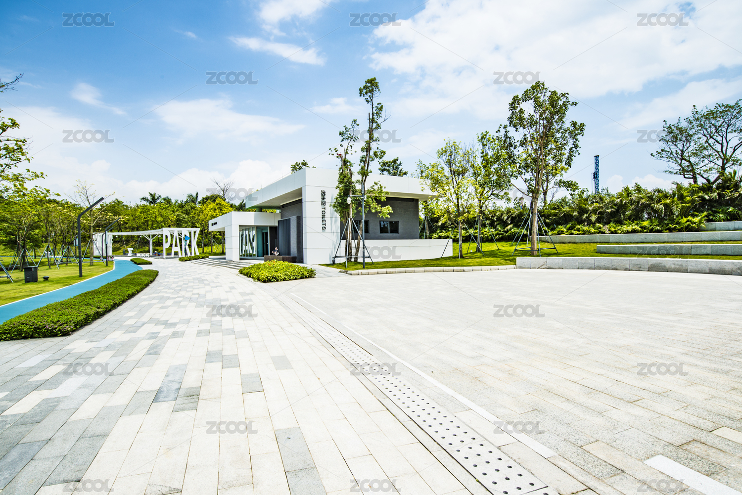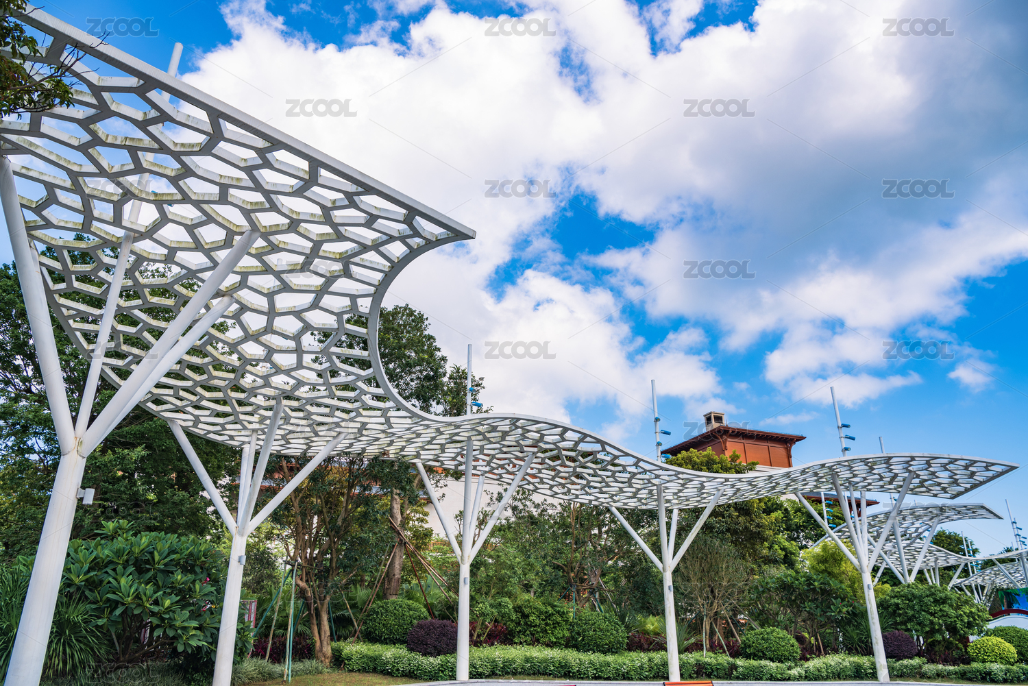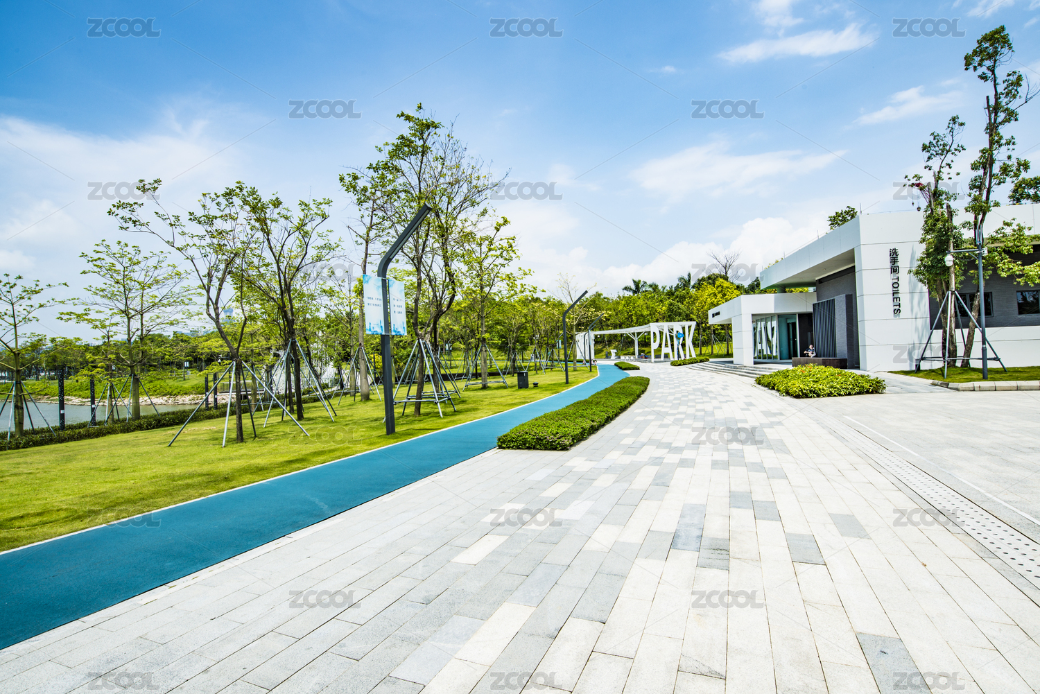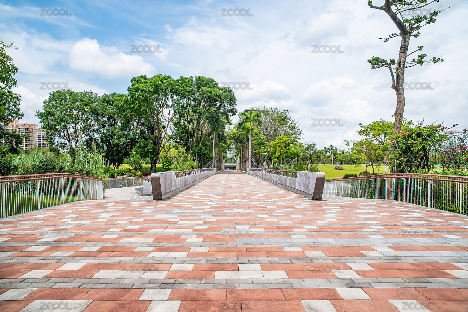 夏季蓝天白云下的深圳香蜜湖公园人行步道