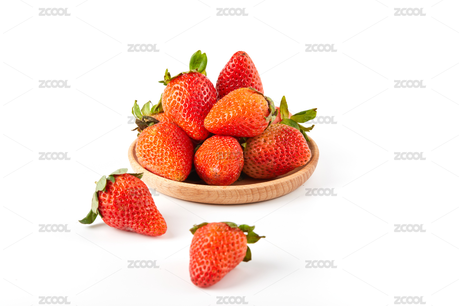 白色背景上簸箕里新鲜草莓与散落的几个草莓