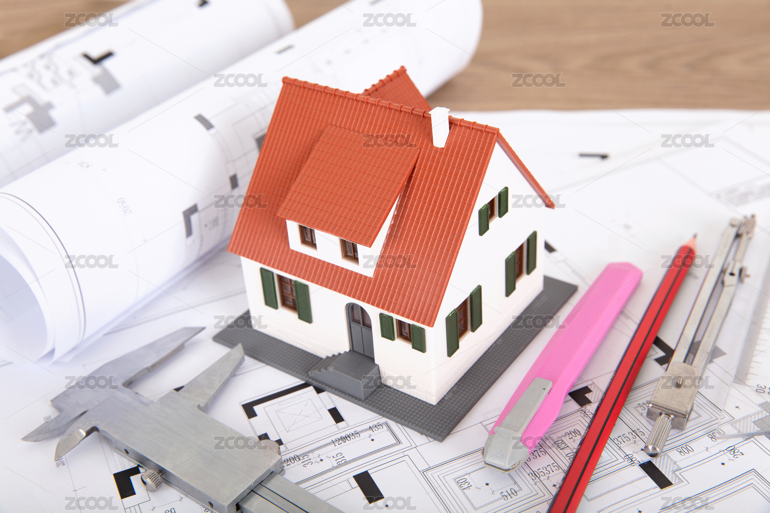 工程施工图纸上被硬币垫起来的小房子模型和几个施工工具