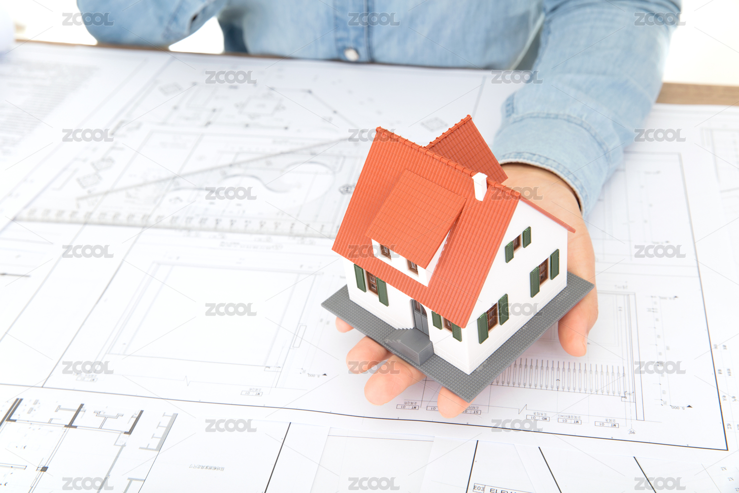 建筑设计师在看图纸及一旁放着一个小房子模型