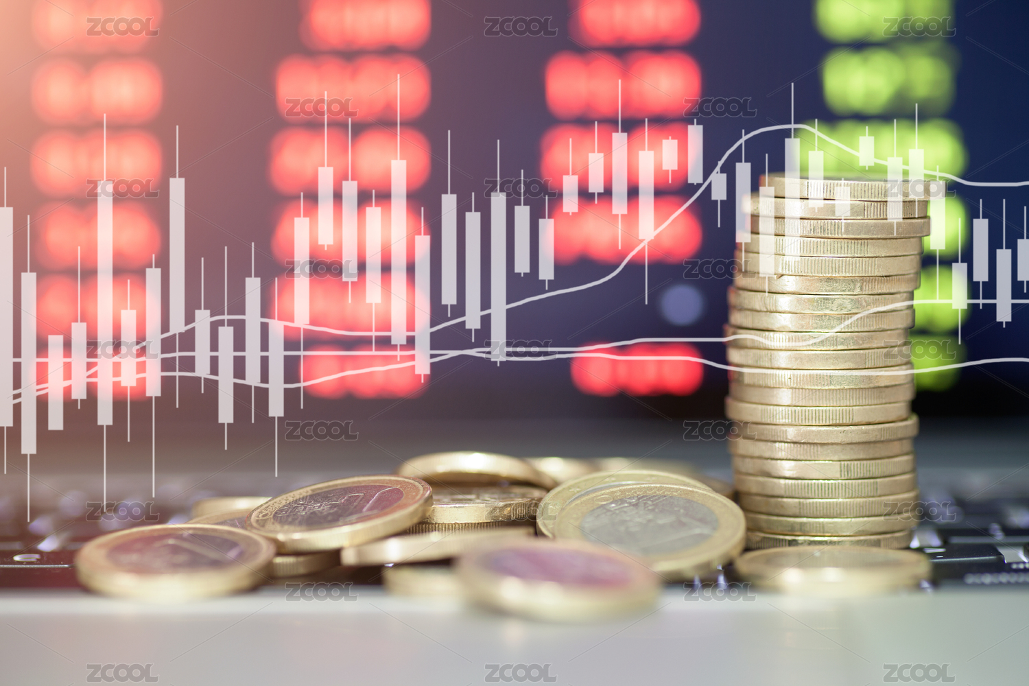电脑屏幕显示着金融投资数据和键盘上一排欧元硬币