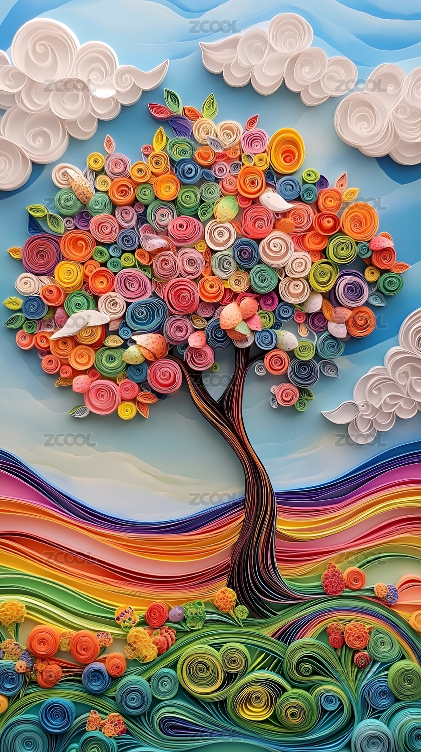 鲜艳明亮抽象彩色颜料植物大树3D立体插画