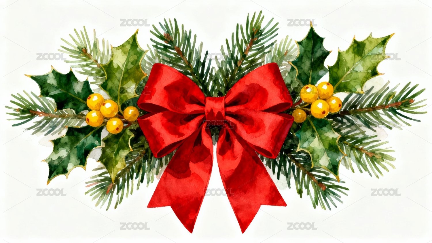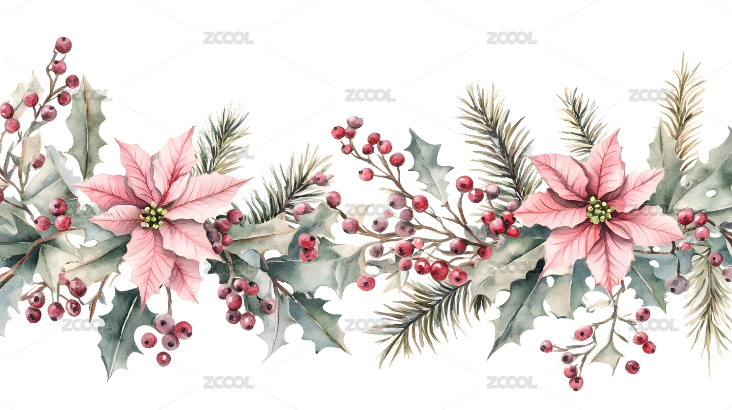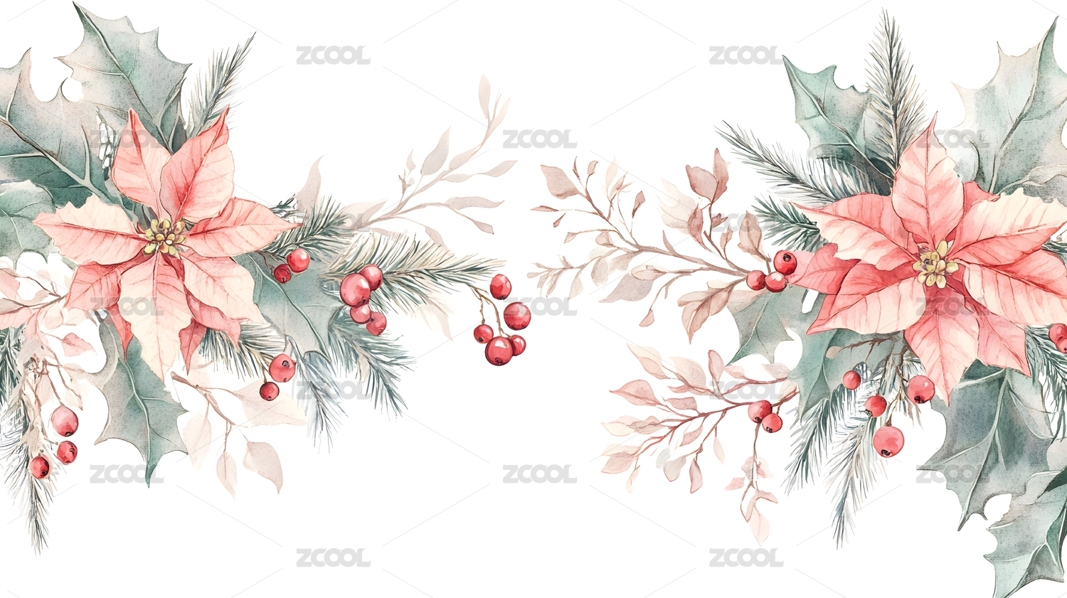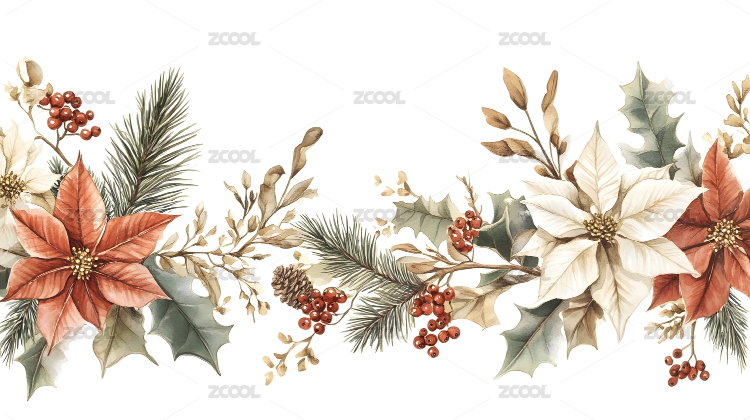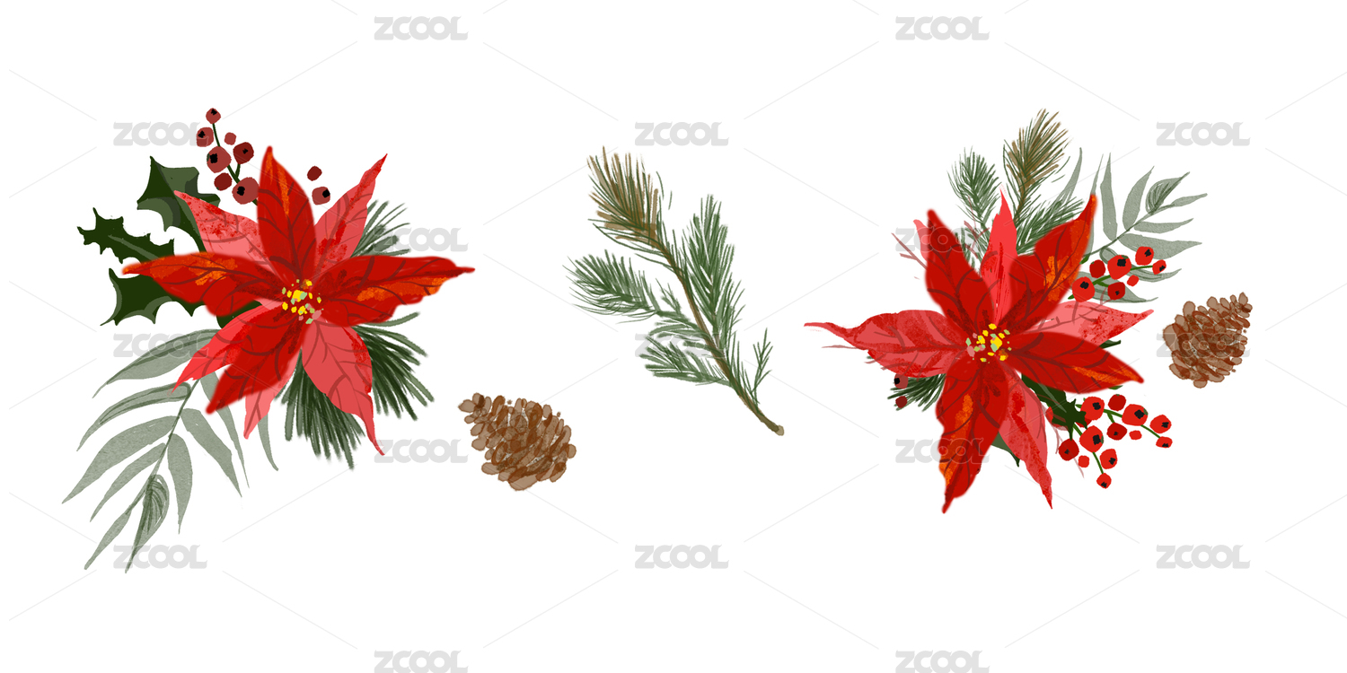 圣诞红植物槲寄生松树水彩手绘插画元素