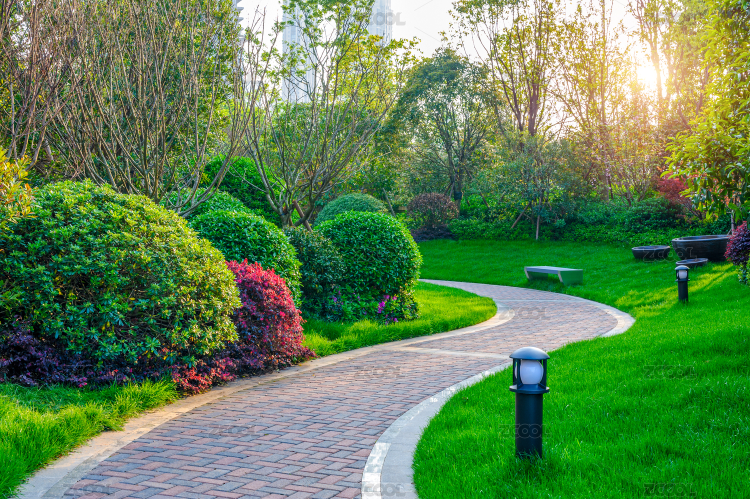 小区住宅里弯曲的步行道,砖路边绿色草坪,园林景观设计