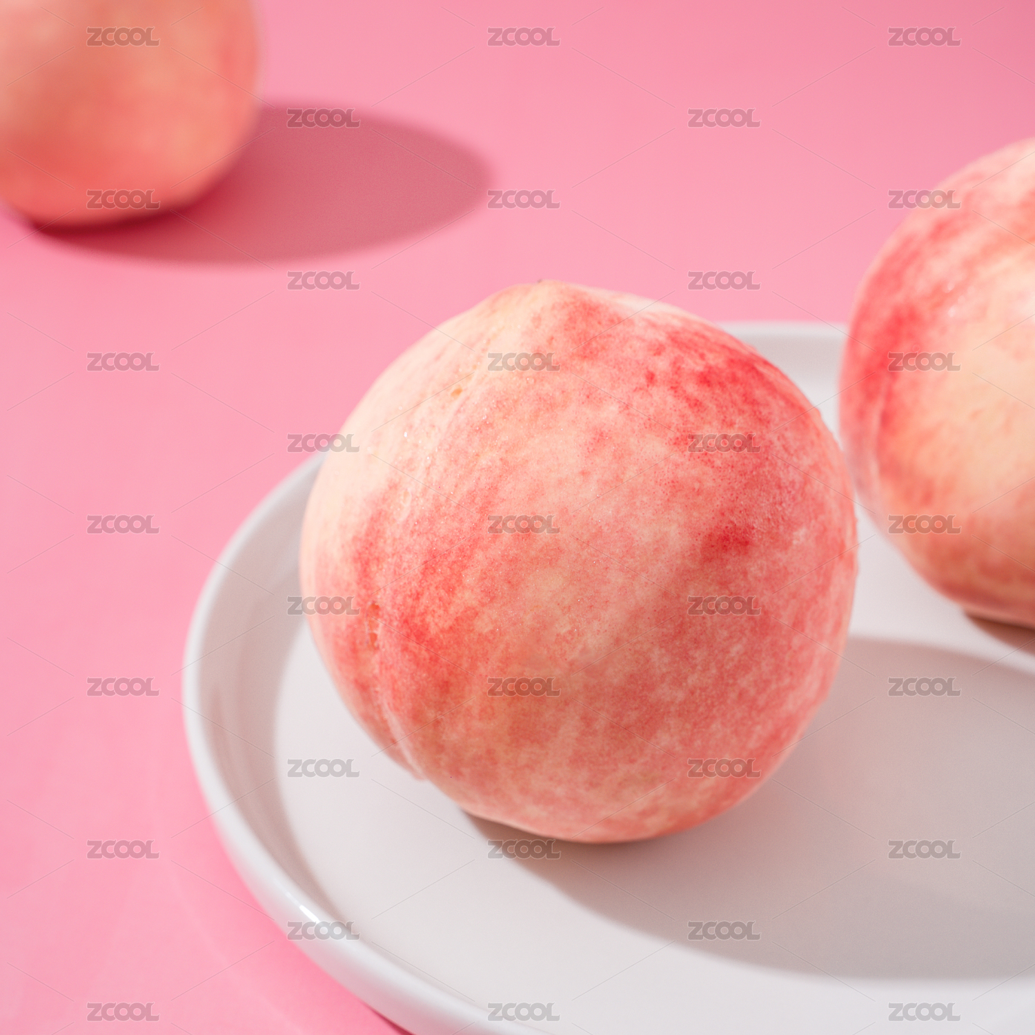 粉色背景白色碟子上放着水蜜桃