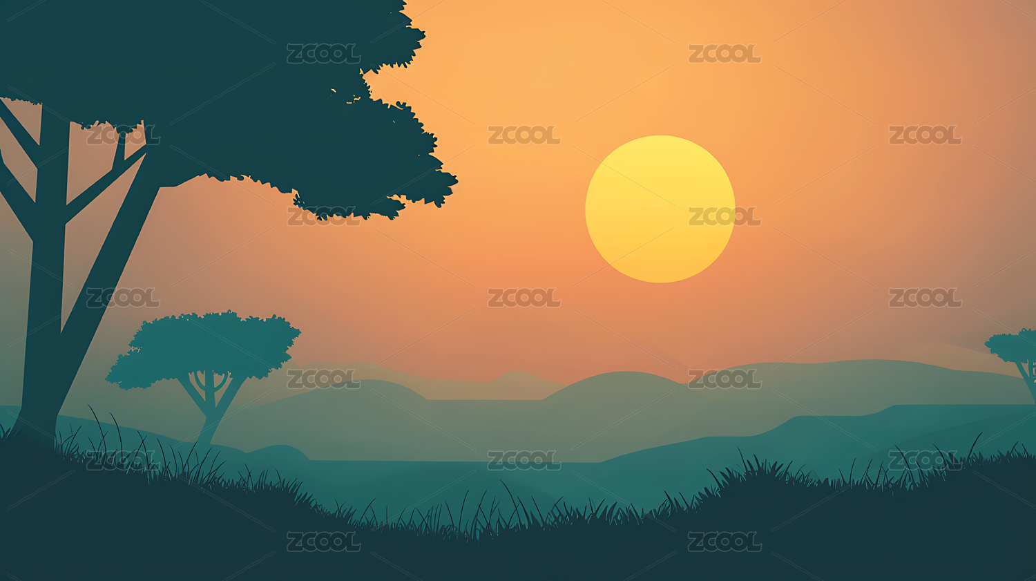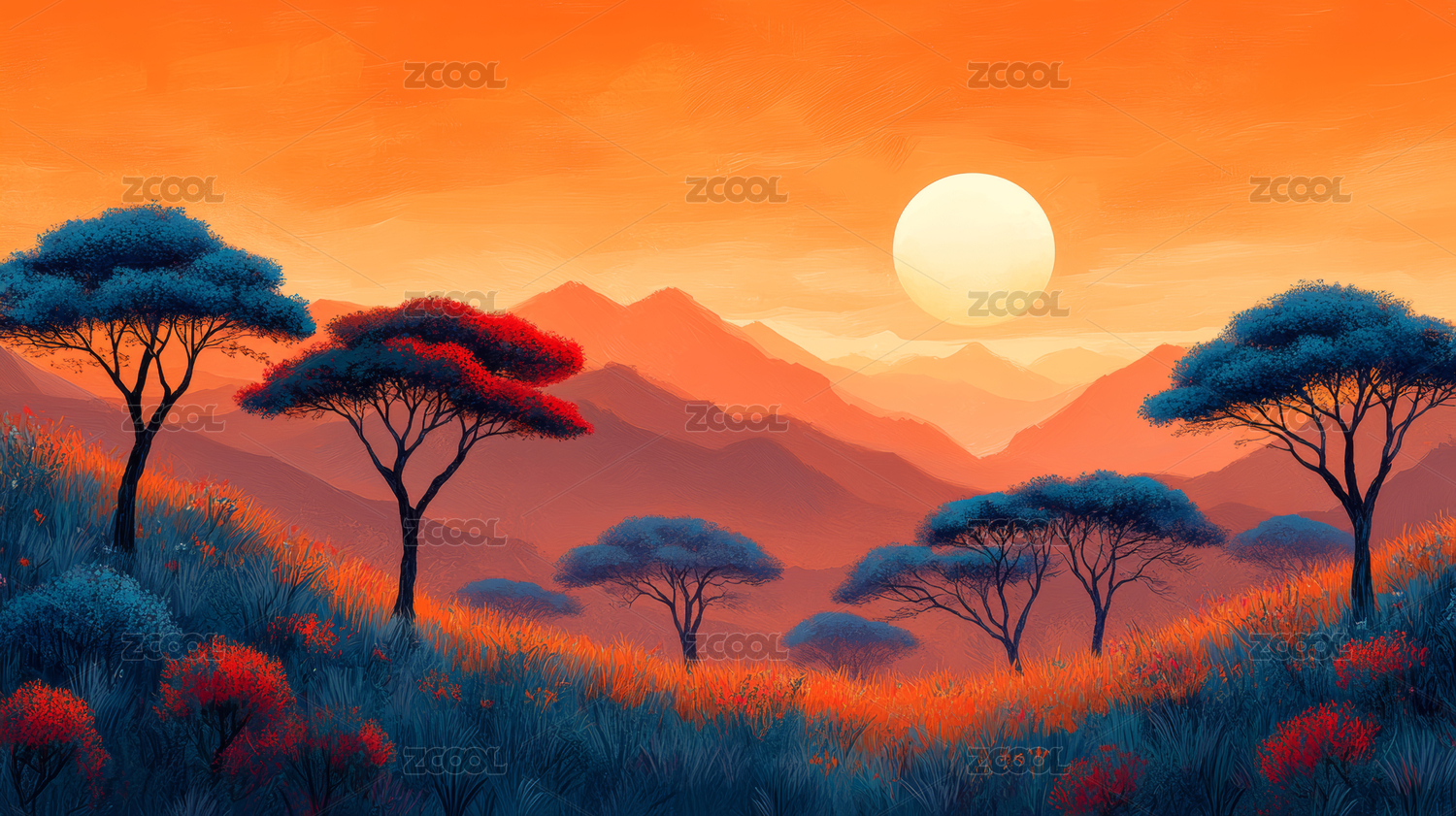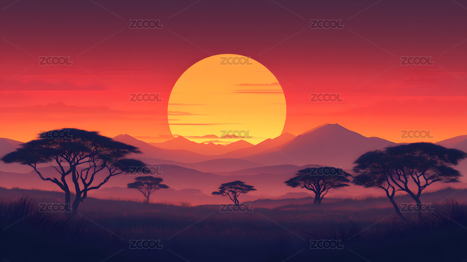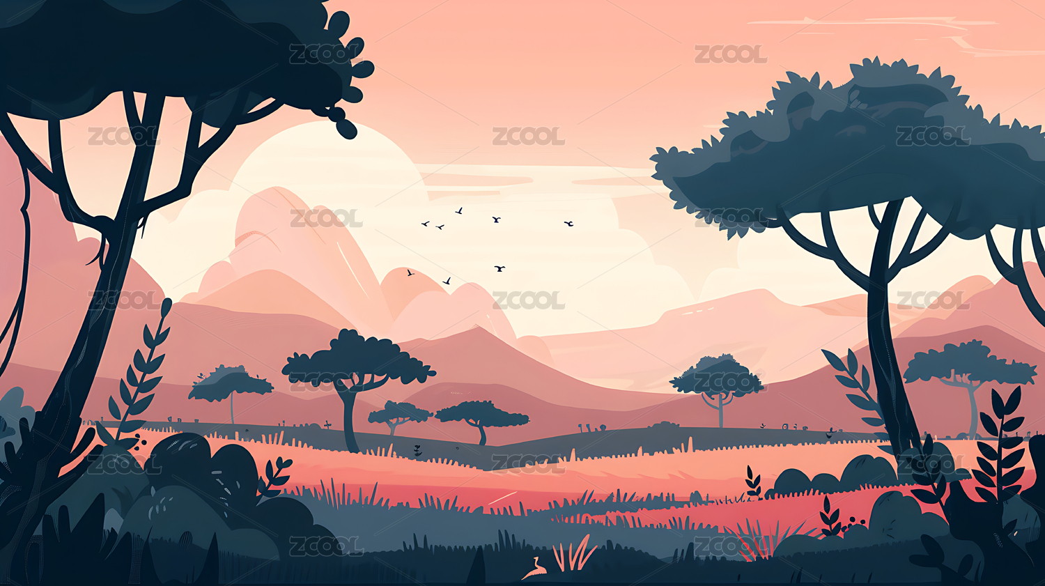 宁静粉红色日落笼罩着宁静稀树草原景观