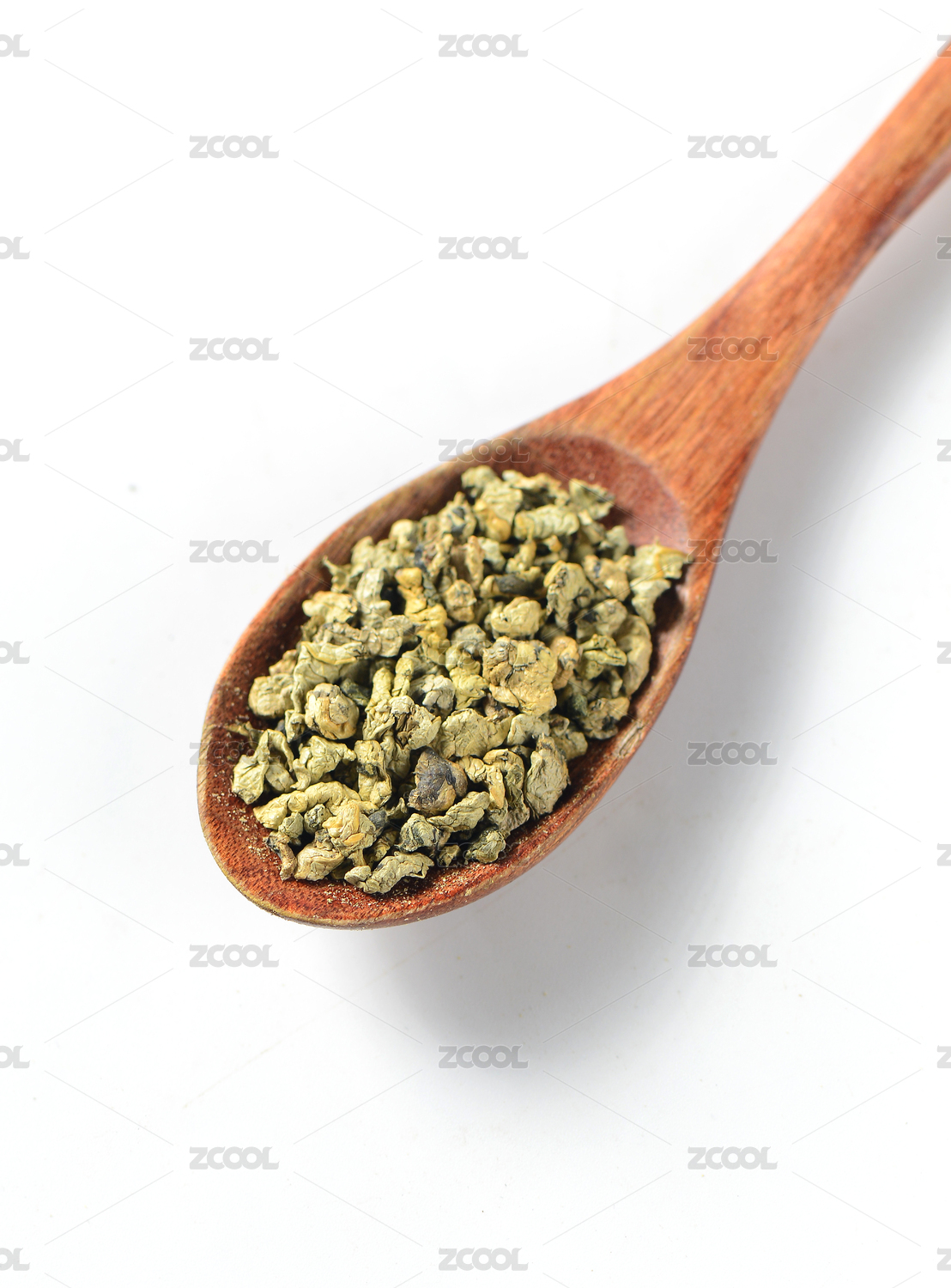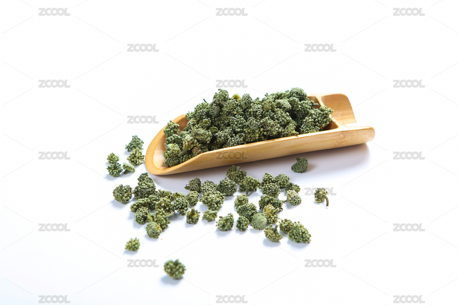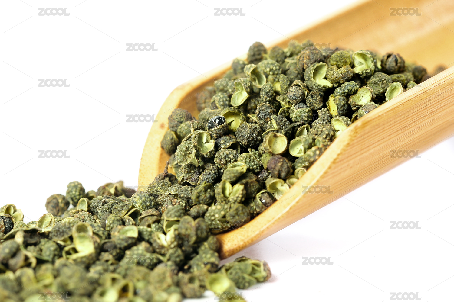 白底上放着麻椒和竹勺里挖着干麻椒