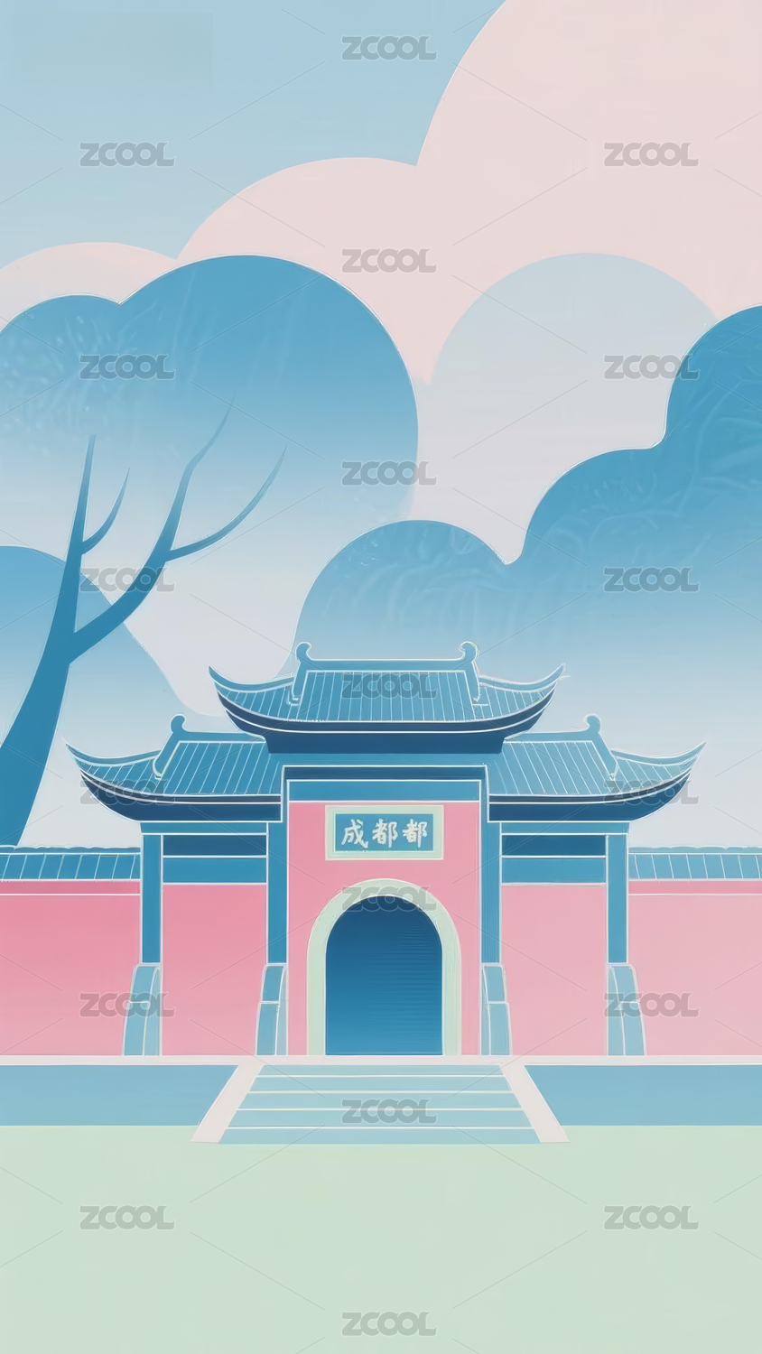 国潮风建筑风景画