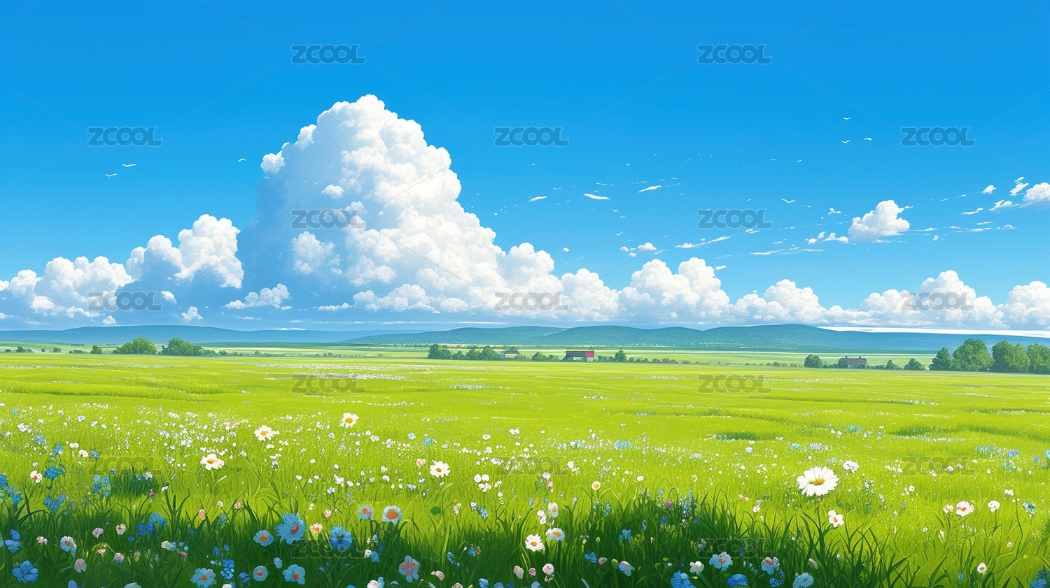 AIGCFG02,春天,鲜花,云朵,云,卡通,插画,风景