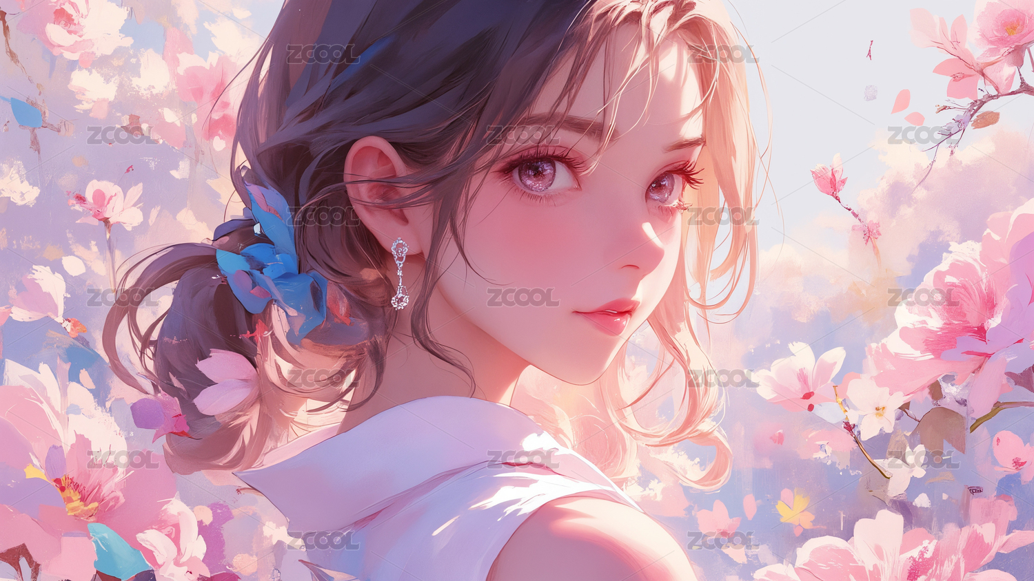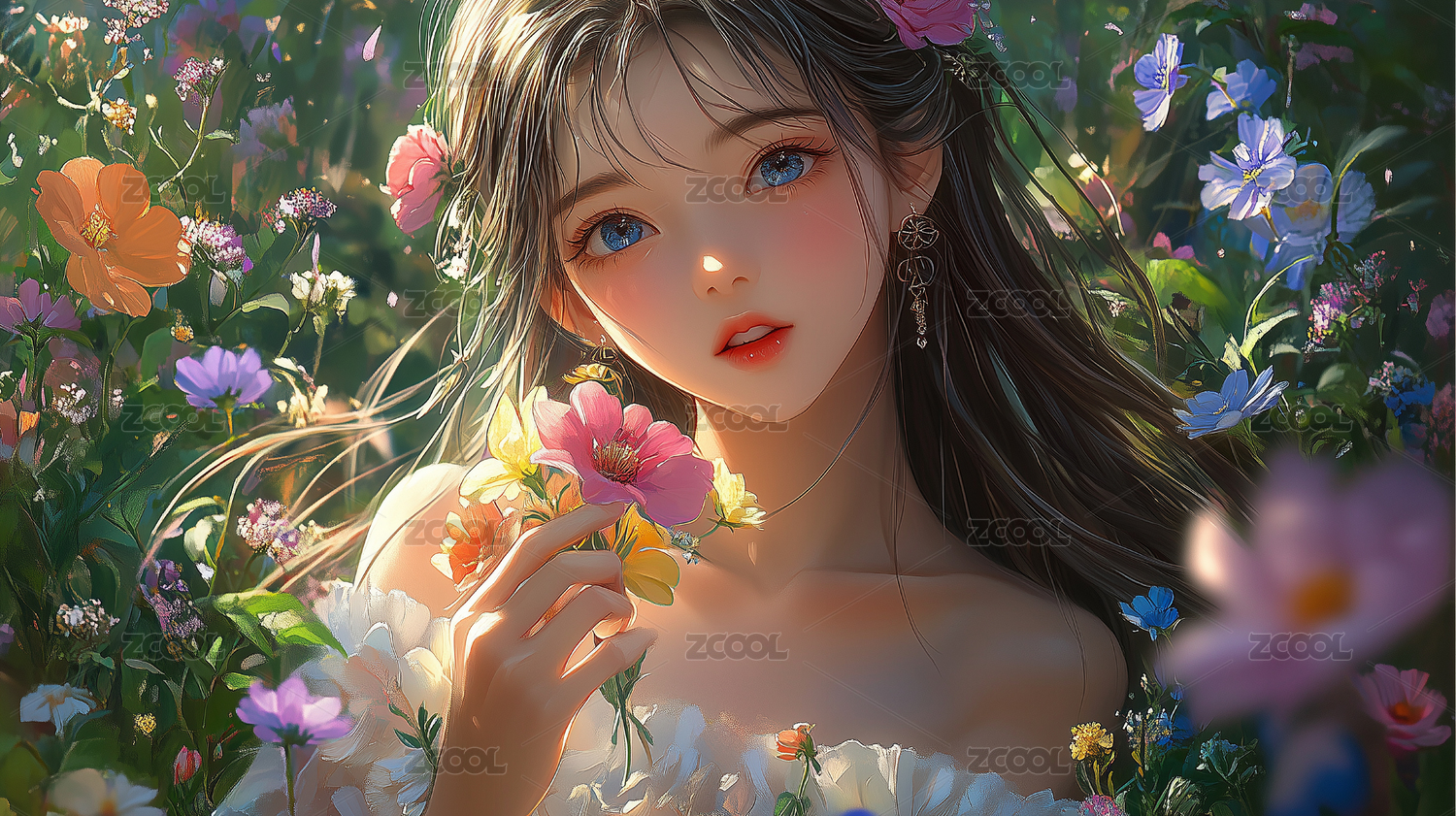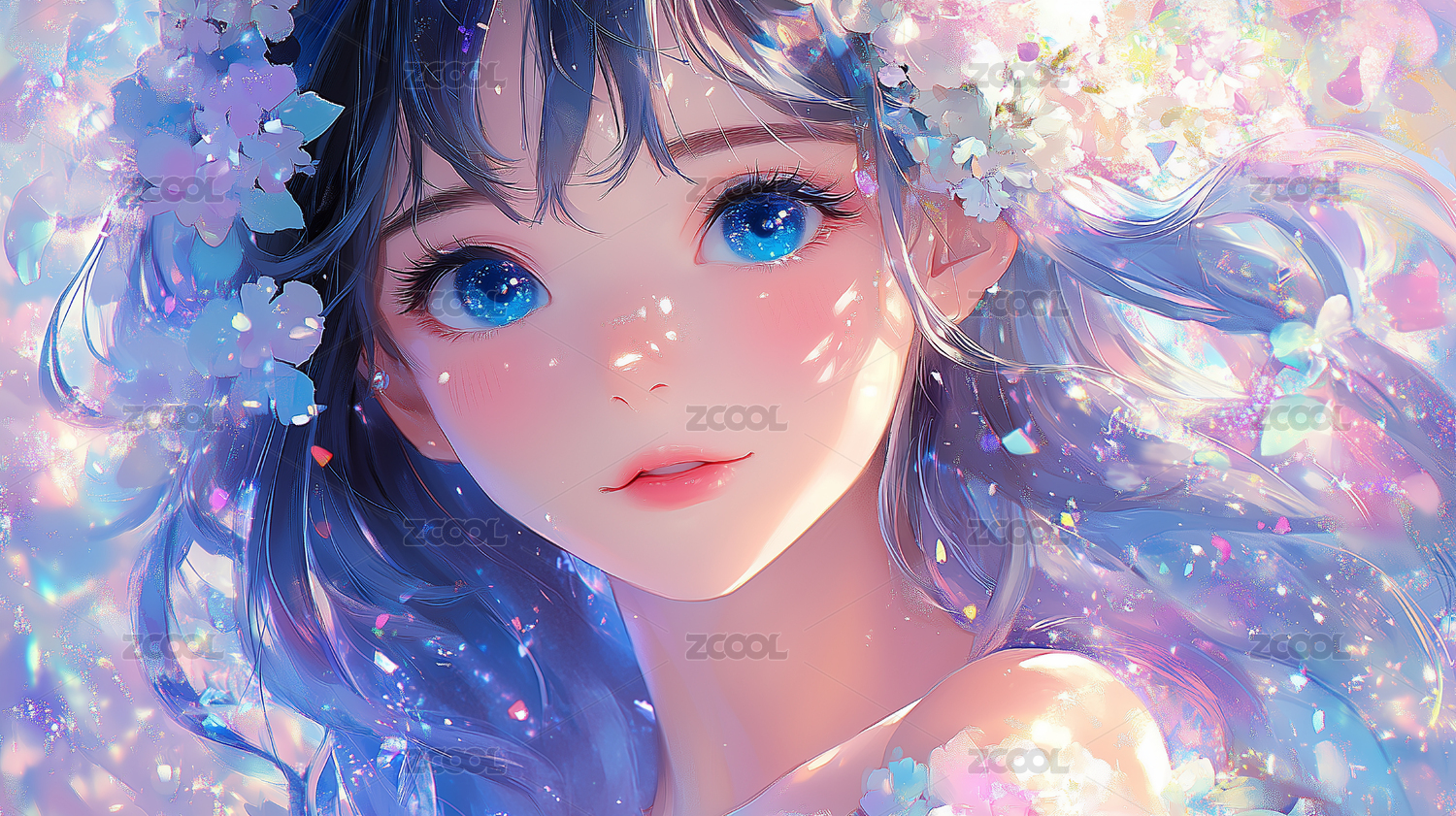 少女,雪白发丝花朵点缀,蓝色眼眸似梦幻