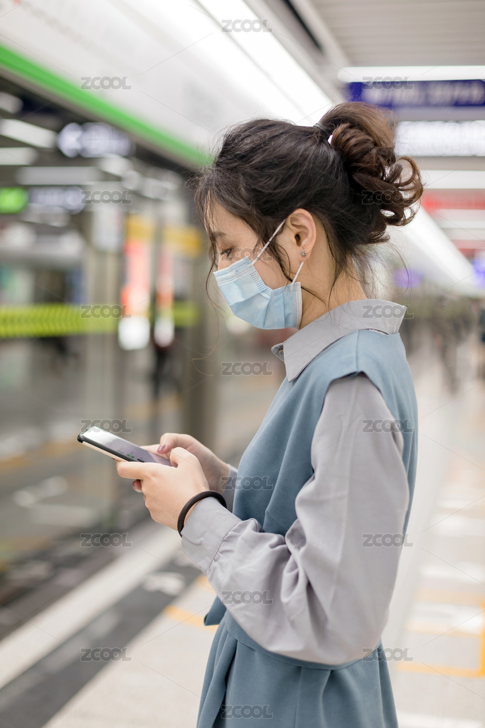 戴口罩女孩等地铁乘车