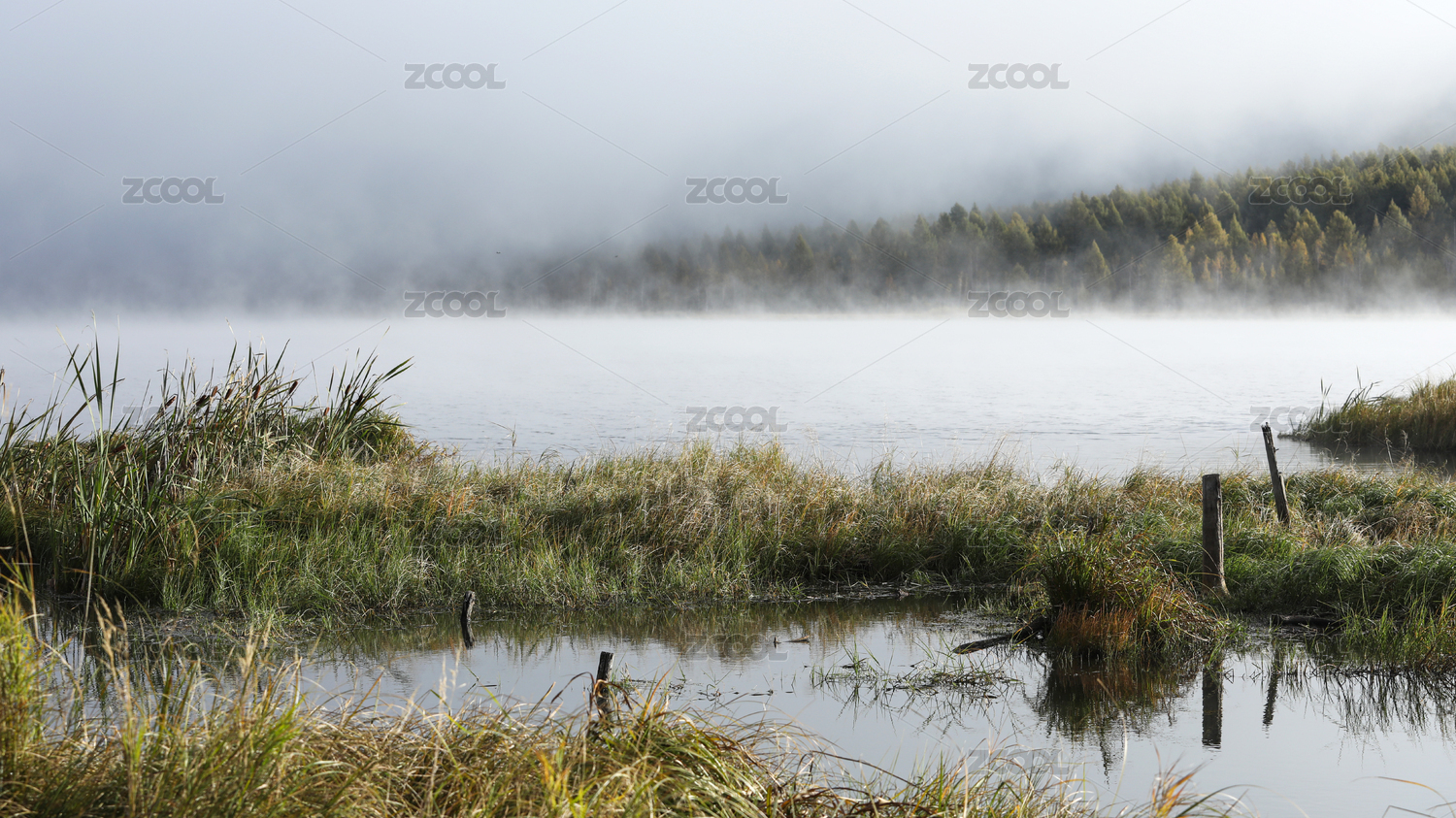 内蒙古阿尔山早晨晨雾和远处森林的自然风景