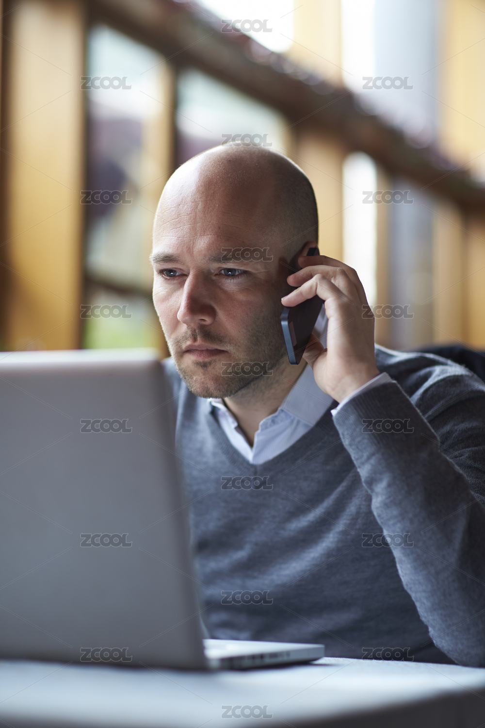 商人在寻找笔记本电脑在电话交谈的思考