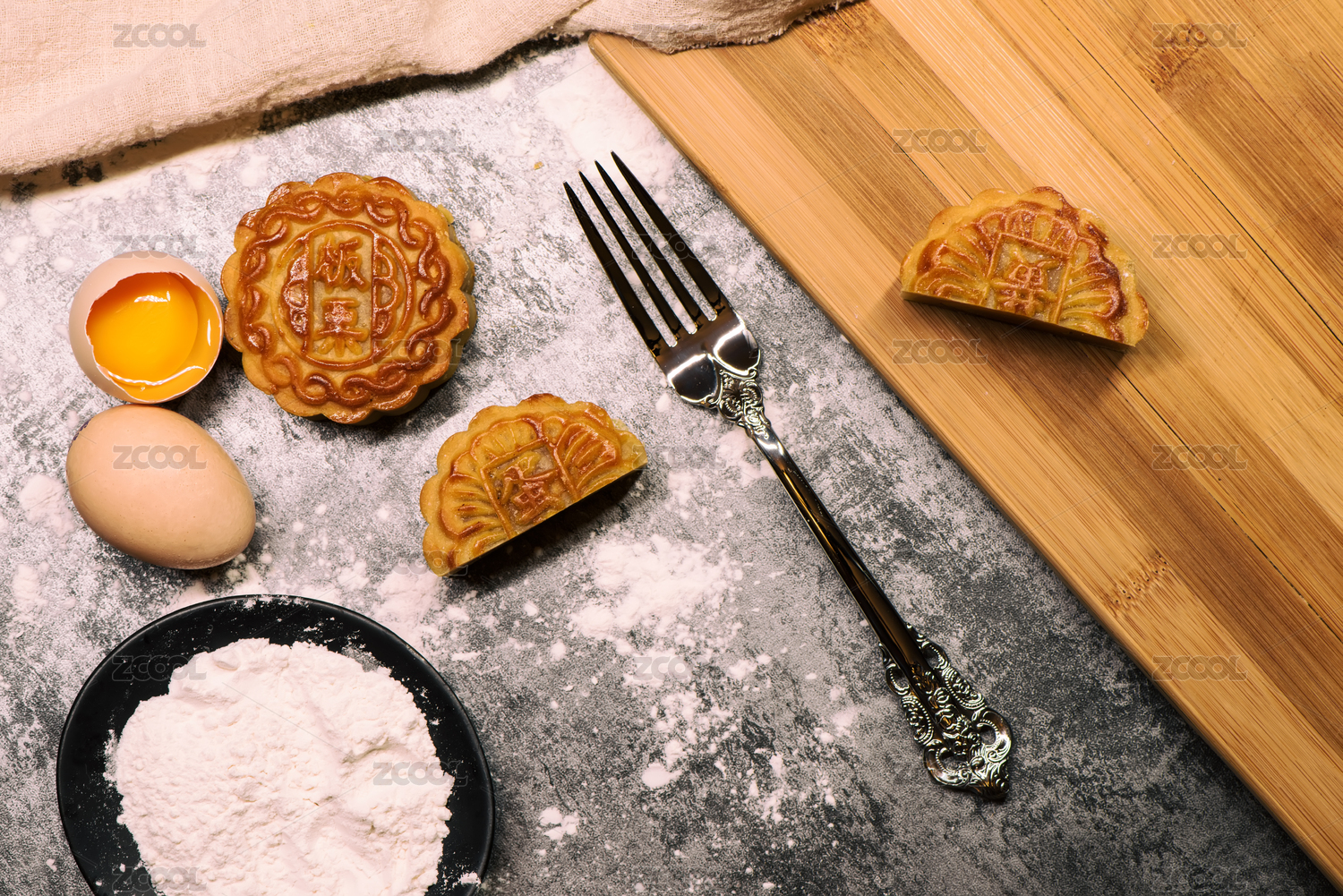 红褐色木板桌面上的月饼,和洒落在旁边的制作原料