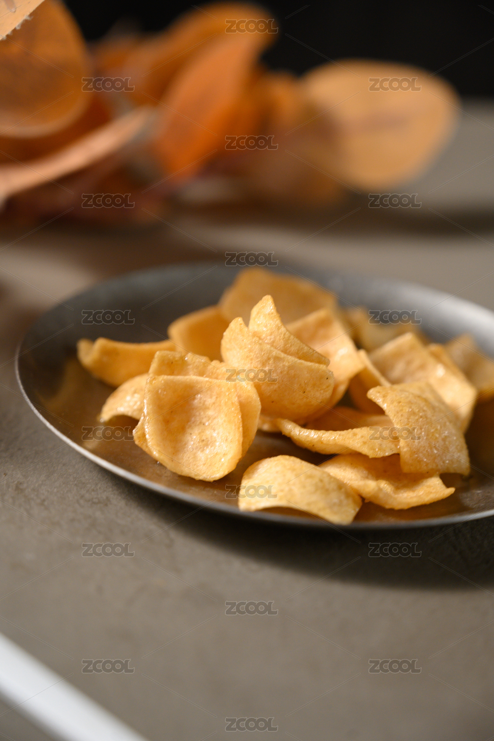 桌面上的白色陶瓷盘子里的美味可口的山药片