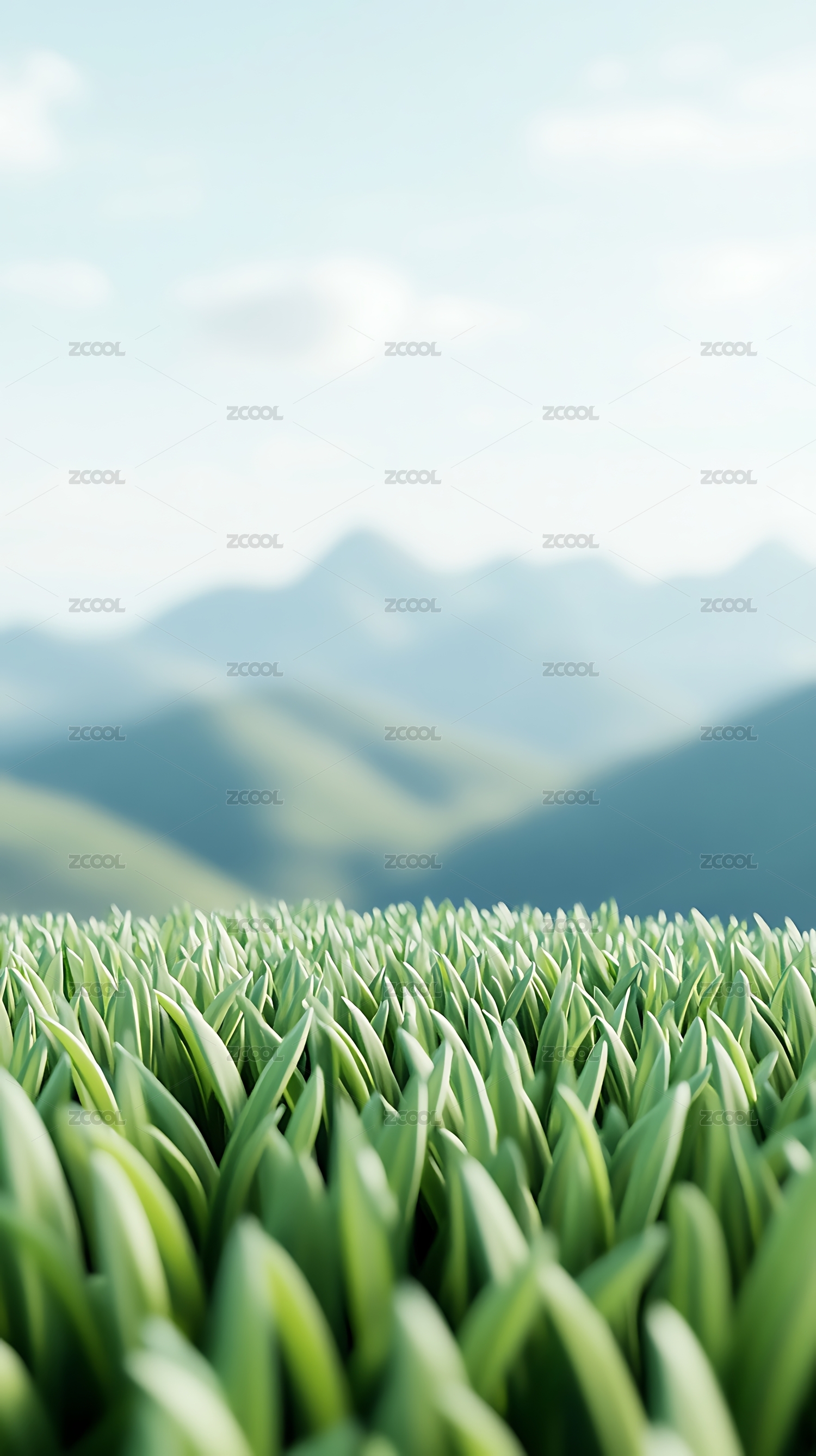 春季晴空下随风摆动麦浪远处青山朦胧风景