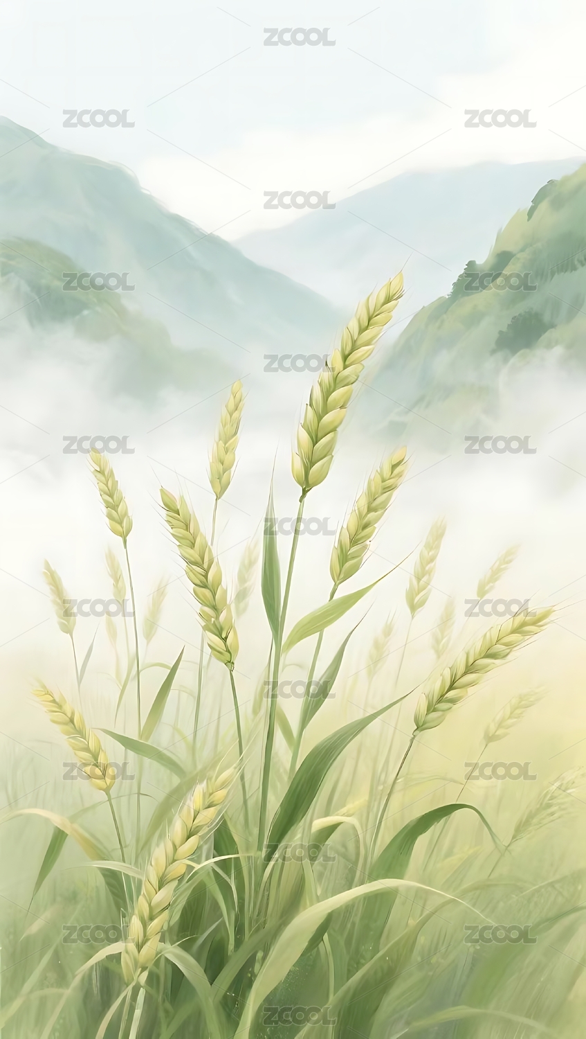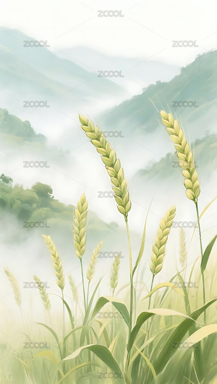 小满节气麦穗生长谷物丰收绿色麦田雨天插画