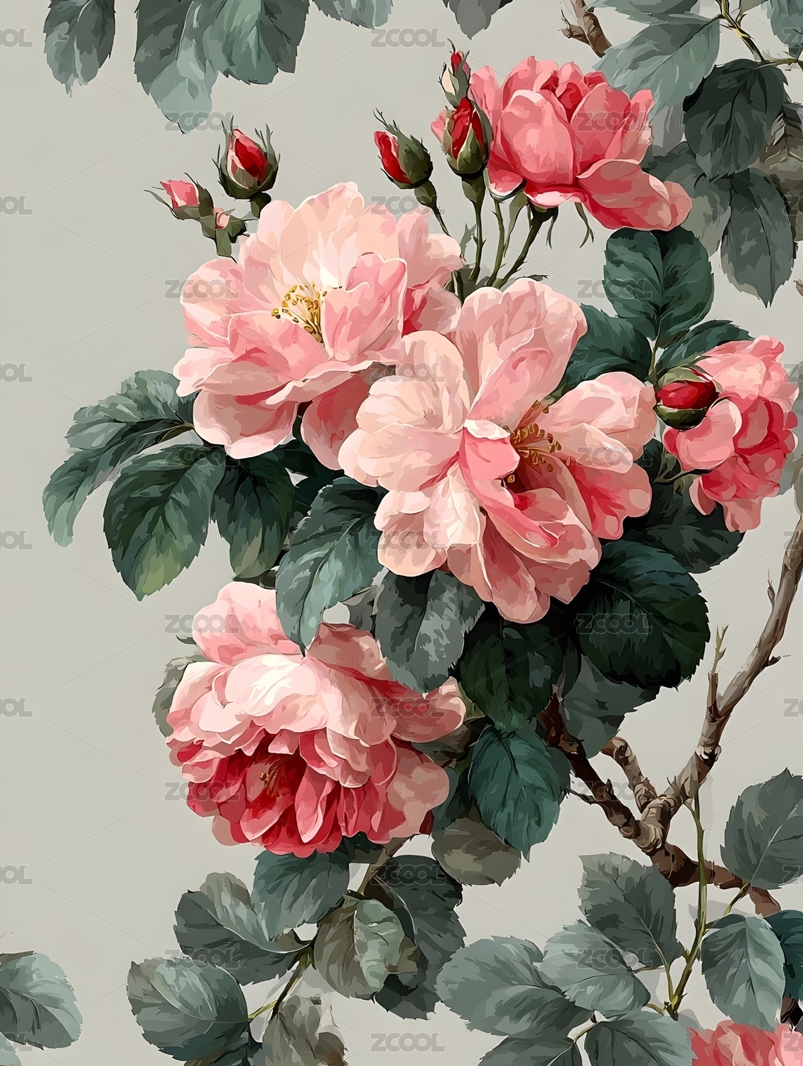 码复古牡丹和花蕾纹理图形海报手机端背景