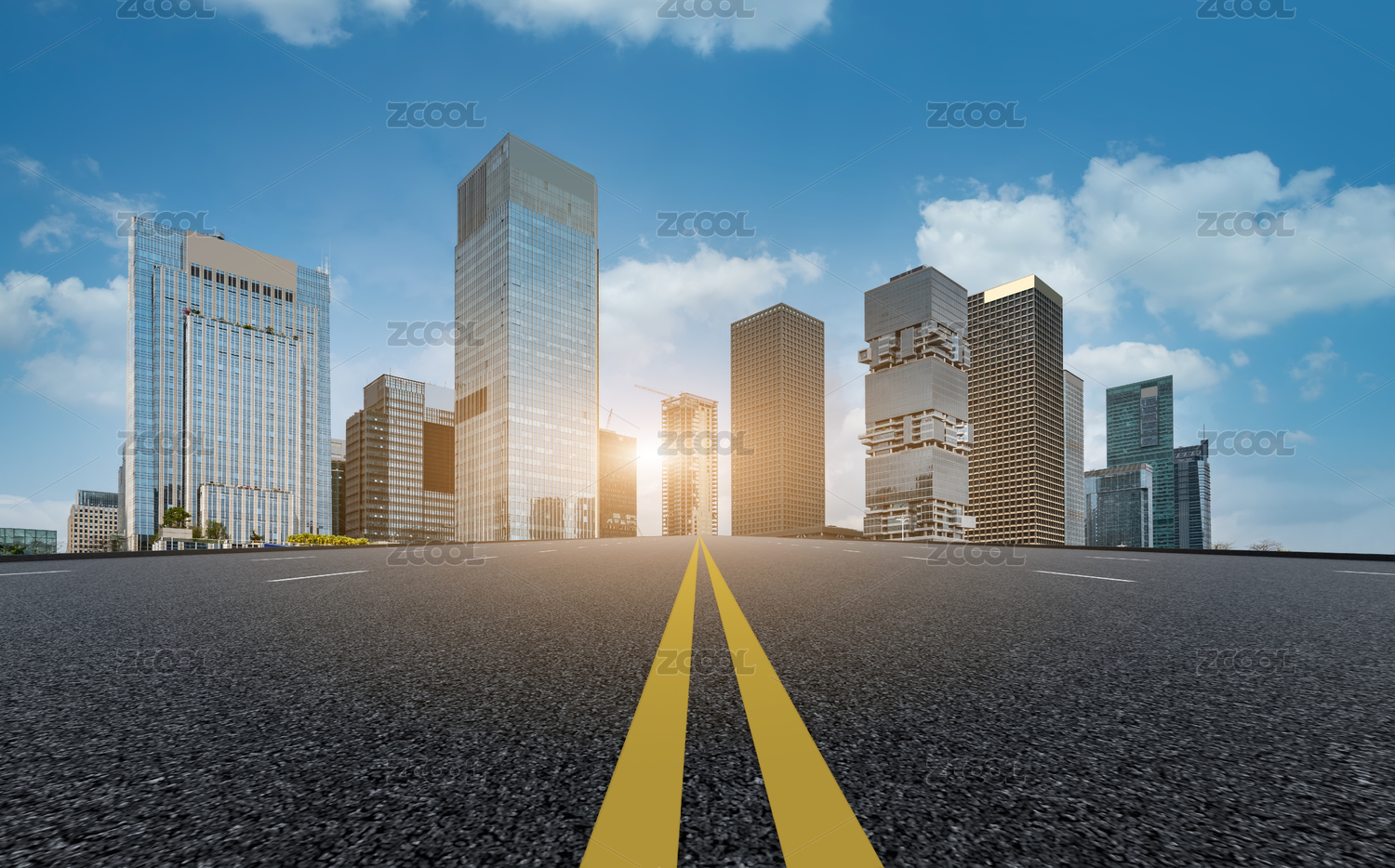 柏油路广场和城市天际线与现代建筑白天场景