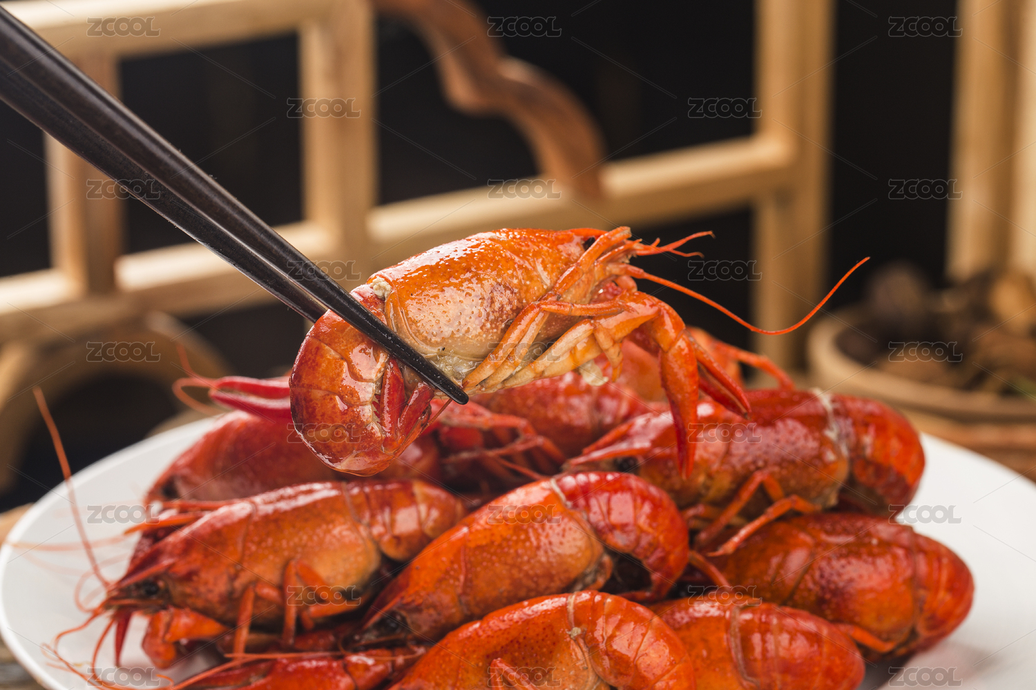 木板背景上满满一盘麻辣小龙虾