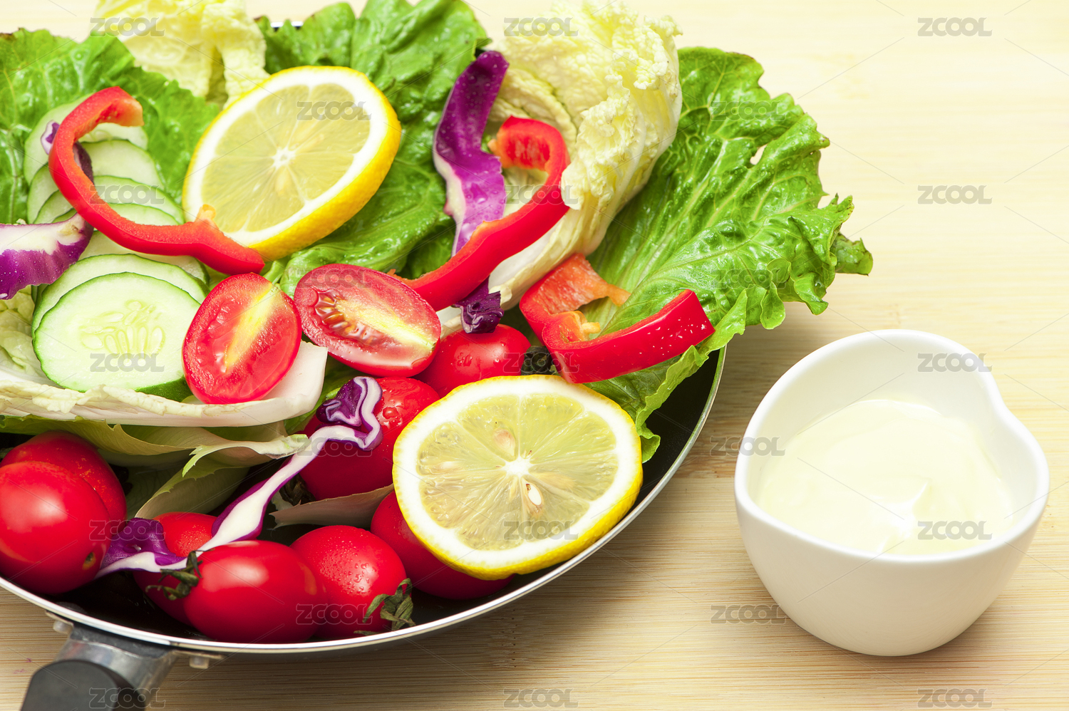 柔光下的蔬菜沙拉与蜂蜜芥末酱