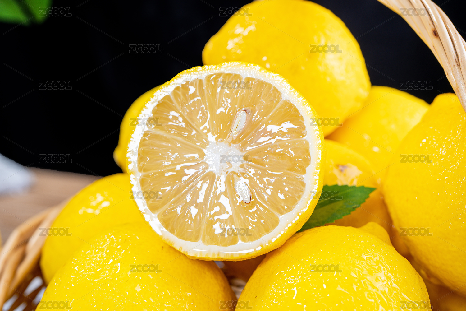 木板上放着一个完整的黄柠檬和两个半边柠檬