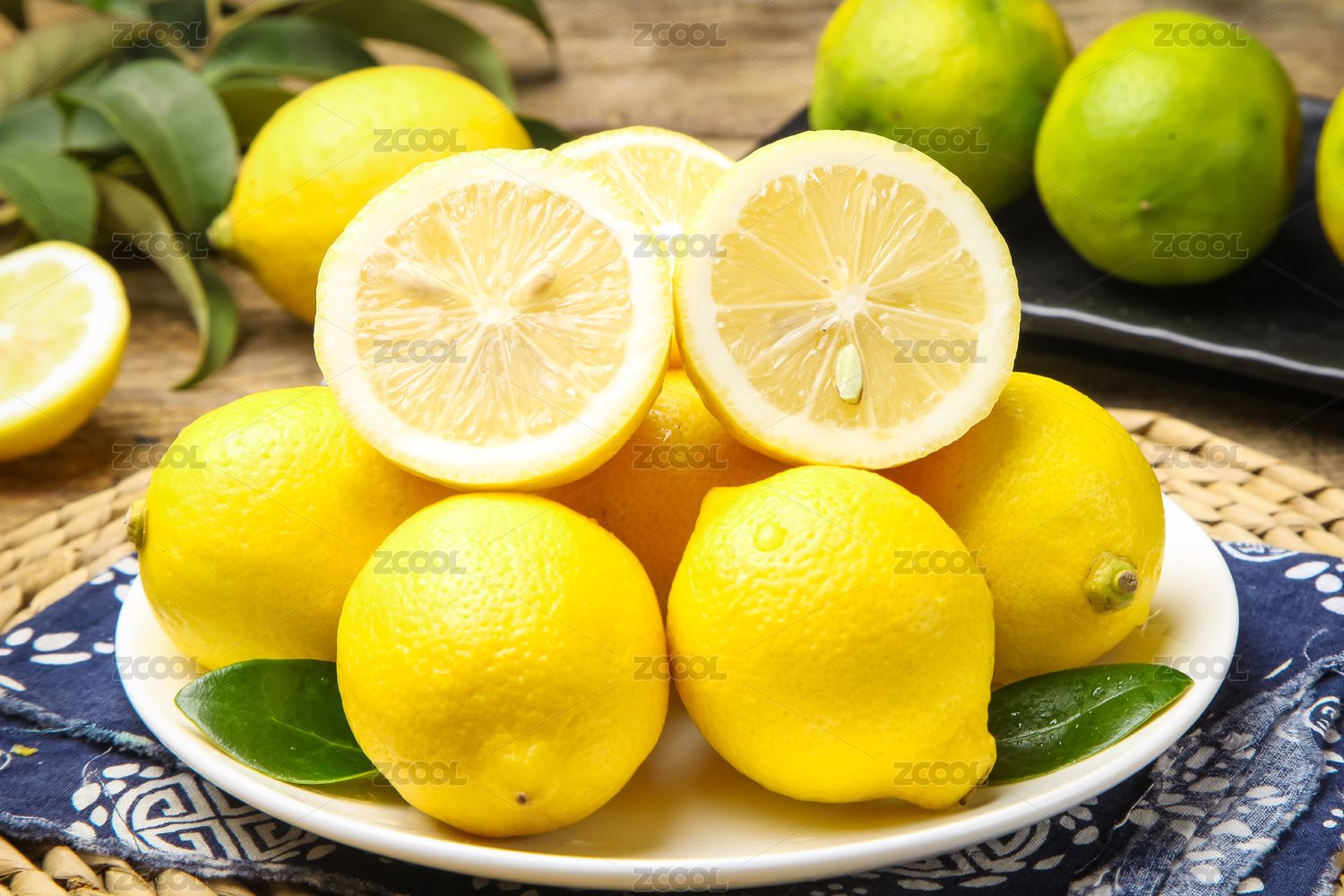 草编垫上盘子里放着有机柠檬和切面的柠檬